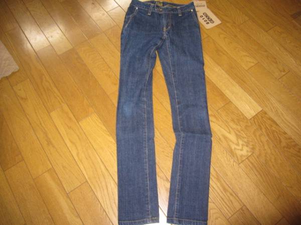 新品 サイズは24インチです。濃いデニムカラーです。ストレッチ素材のスキニージーンズです。フロントボタン部分がおしゃれfでこだわりのあるジーンズです。全長97cm股上18cm股下78cmウエスト66cmヒップ82cmです。バックのポケットのステッチも素敵です。購入価格は¥19950と税です。