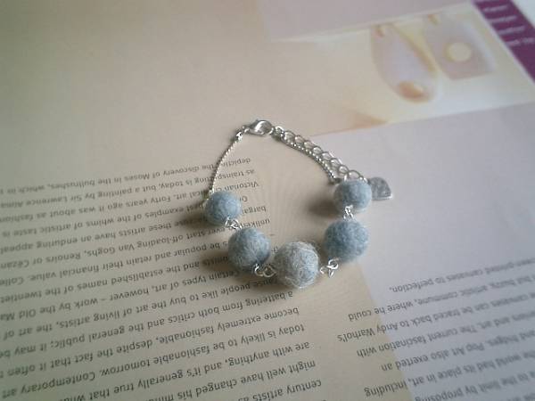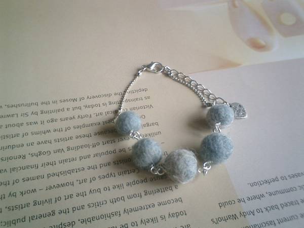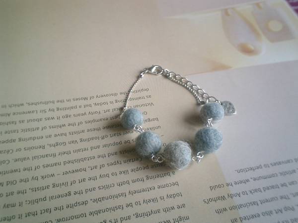 お気に入りのフォルム・・シリーズです♪水色に恋して・・ふんわりやさしいフェルト玉のブレスレットです♪ブルーグレーの小さなフェルト玉を繋いでシンプルなデザインです♪フェルト玉は11ミリから13ミリ位までの大きさ違いです♪華奢なボールチェーンを合わせました♪長さは16センチ+アジャスター6センチで最長22センチ位です♪お揃いのネックレスやイヤリングも出品しています♪シンプルで飽きのこないいつまでも着けられるデザインを考えて作りました!ハンドメイドをご理解頂いてノークレーム、ノーリターンでお願いします