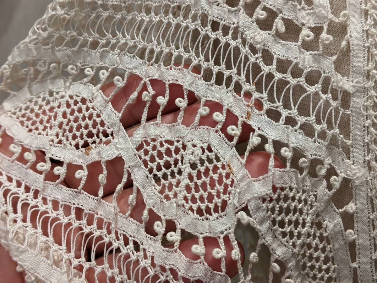 ボビンレース編みにてリボンをつなぎ合わせたと思われる、凝った手仕事による羽織りブラウスです