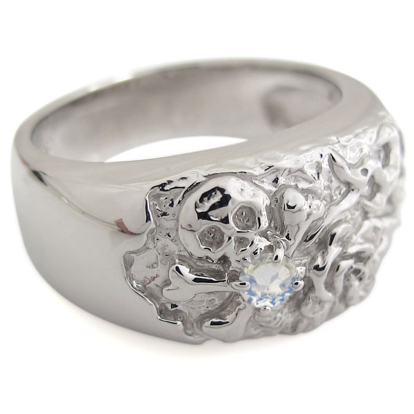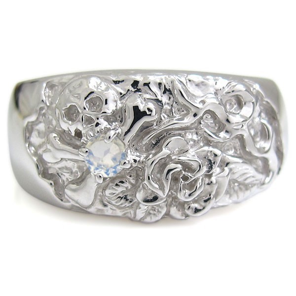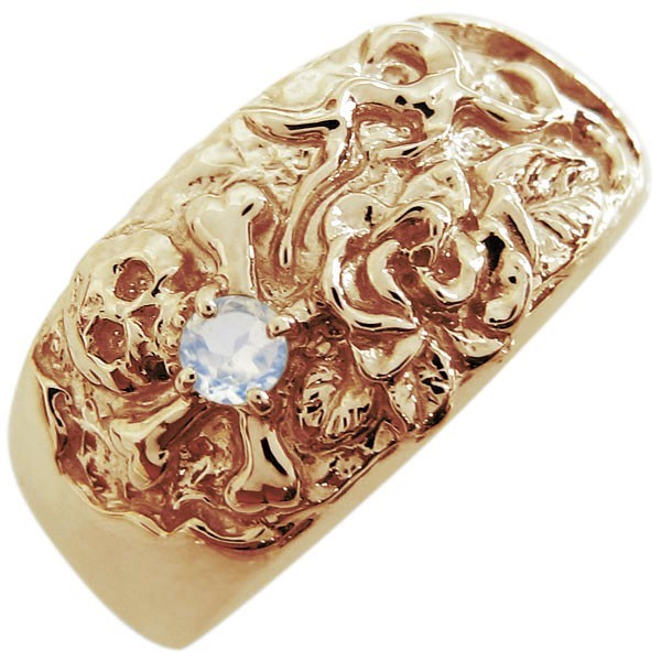 6月誕生石ロイヤルブルームーンストーンを一粒使用した、18金製のスカル(骸骨)&バラをモチーフしたメンズリング(指輪)です。