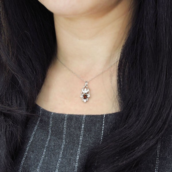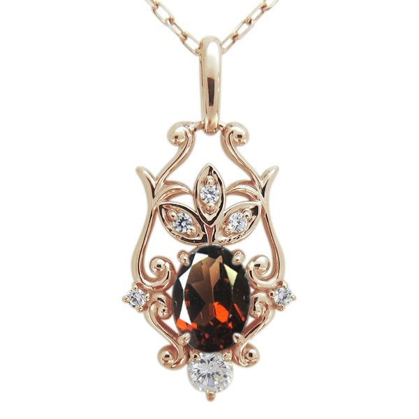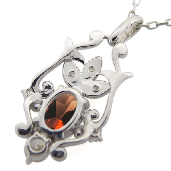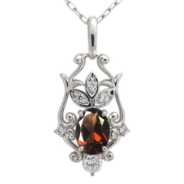 1月誕生石大粒ガーネットを一粒使用したシルバー製の、唐草デザインレディースネックレス(ペンダント)です。