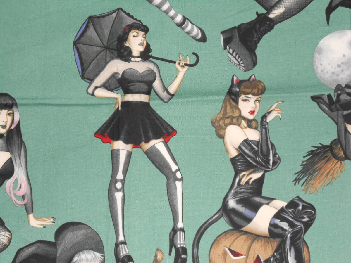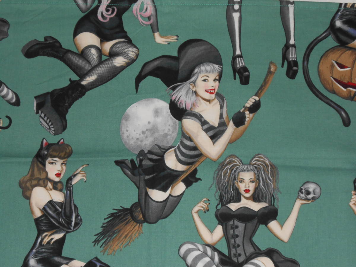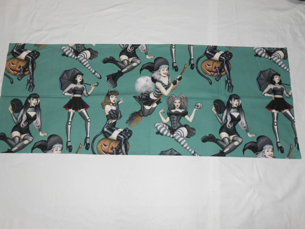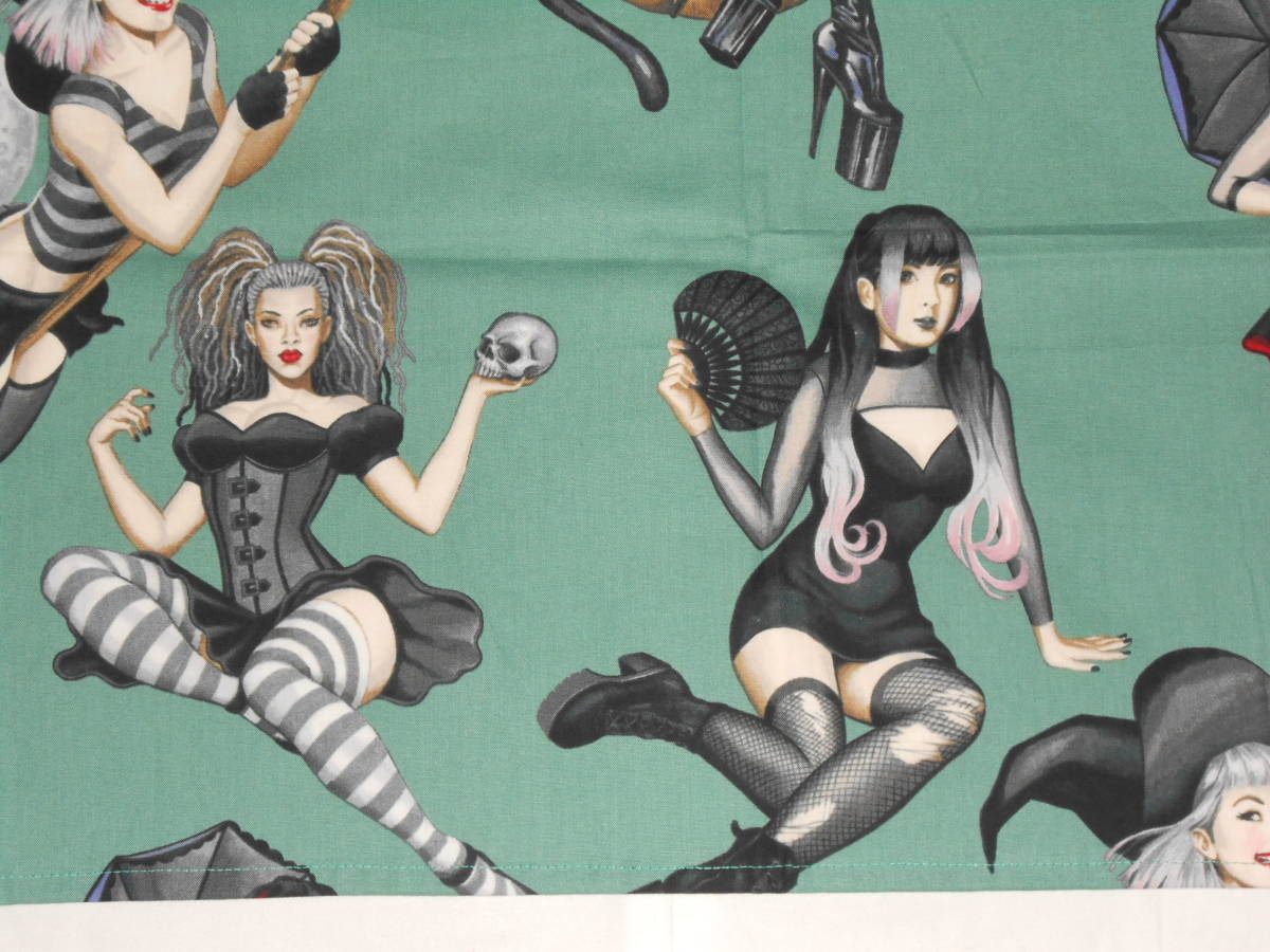 手作り綿100%、テーブルクロス、おしゃれな魔女達、緑、42cm×106cm、①