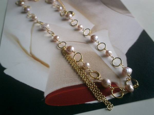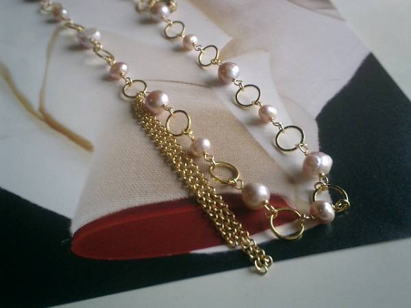 お気に入りのフォルム・・シリーズです♪ジャンヌのパール・・ふんわりやさしいピンクパープルの淡水パールのネックレスです♪7ミリから10ミリ位までのバロックやポテトの淡水パールに小さなデザインリングやチェーンを合わせてさりげなく可愛いです♪長さは全長70センチ位で調節自由です♪アクセントのチェーンの長さは9センチ位です♪お揃いのブレスレットやピアスも出品しています♪シンプルで飽きのこないいつまでも着けられるデザインを考えて作りました!ハンドメイドをご理解頂いてノークレーム、ノーリターンでお願いします