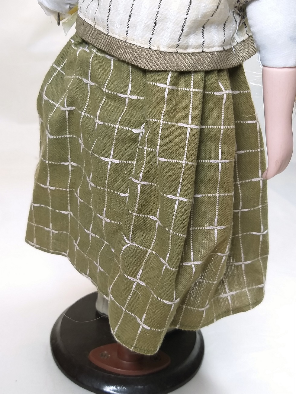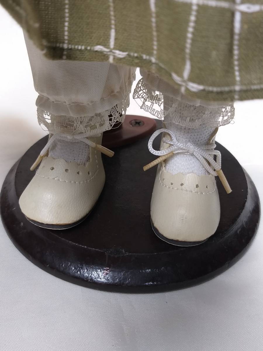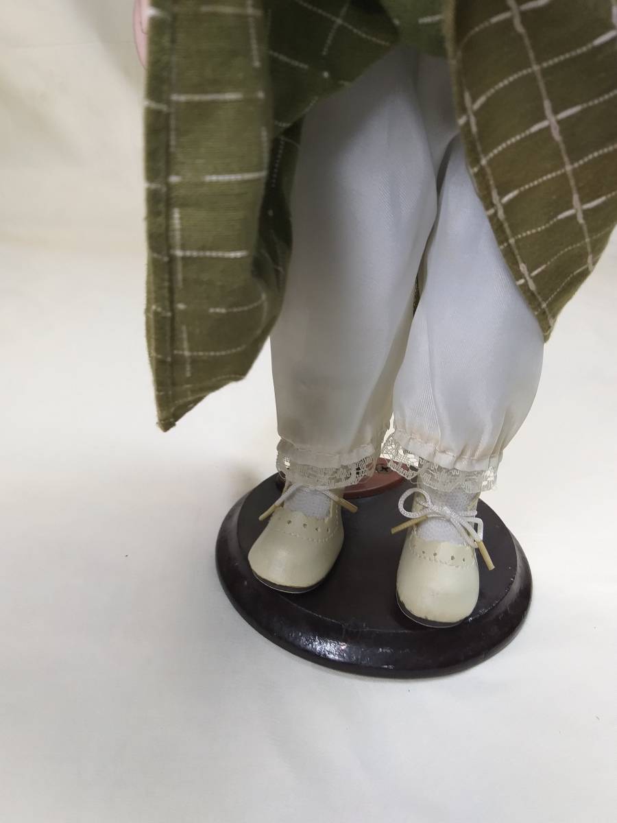 この品は、全て手工芸により制作されている人形です。身に着けている服は、人の比率で縮小し手工芸により縫製されております。着脱ぎ可能で、交換できます。靴は、本羊革製で、もちろん着脱ぎ可能です。人形は台座から自由に取り外すことが出来ますので、置物とすることも、手に取ることも出来ます。