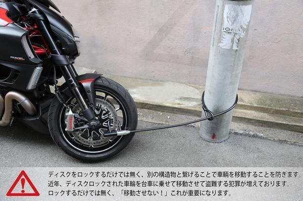 ■BIGROWワイヤー&ディスクロック最強の盗難防止アイテム! ◎ワイヤー&ディスクロックの表面は施錠時にホイールや車体へ傷を付けない樹脂コートが施されています。 物理的にディスクブレーキを回転しないようにするロック機能と車輛を別の構造物等に結びつけて車輛自体を移動させなくするワイヤーロックを一体化した画期的なロックです。 ※注意近年ディスクをロックしていても、ロックされた車輪を台車等に乗せて移動させる盗難方法が横行しております ロックした上で移動させないこのロックでパーフェクトガード! ■付属キーは特殊なキーで、鍵穴を潰すのも困難。 ■スペアーキーを付属。 ■極太の直径15mmワイヤーは切断困難! ■ワイヤーは極太ですが、柔軟性があり収納する際等はまとめやすい性質を持った特殊ワイヤー。 ■ロックとワイヤーは全て樹脂でコートされているので、大事な愛車へ傷をつけない親切設計。 ◎外出時の路駐やアパート・マンション等、部屋から駐輪場までに距離のあるユーザー様にも力強い味方!! |