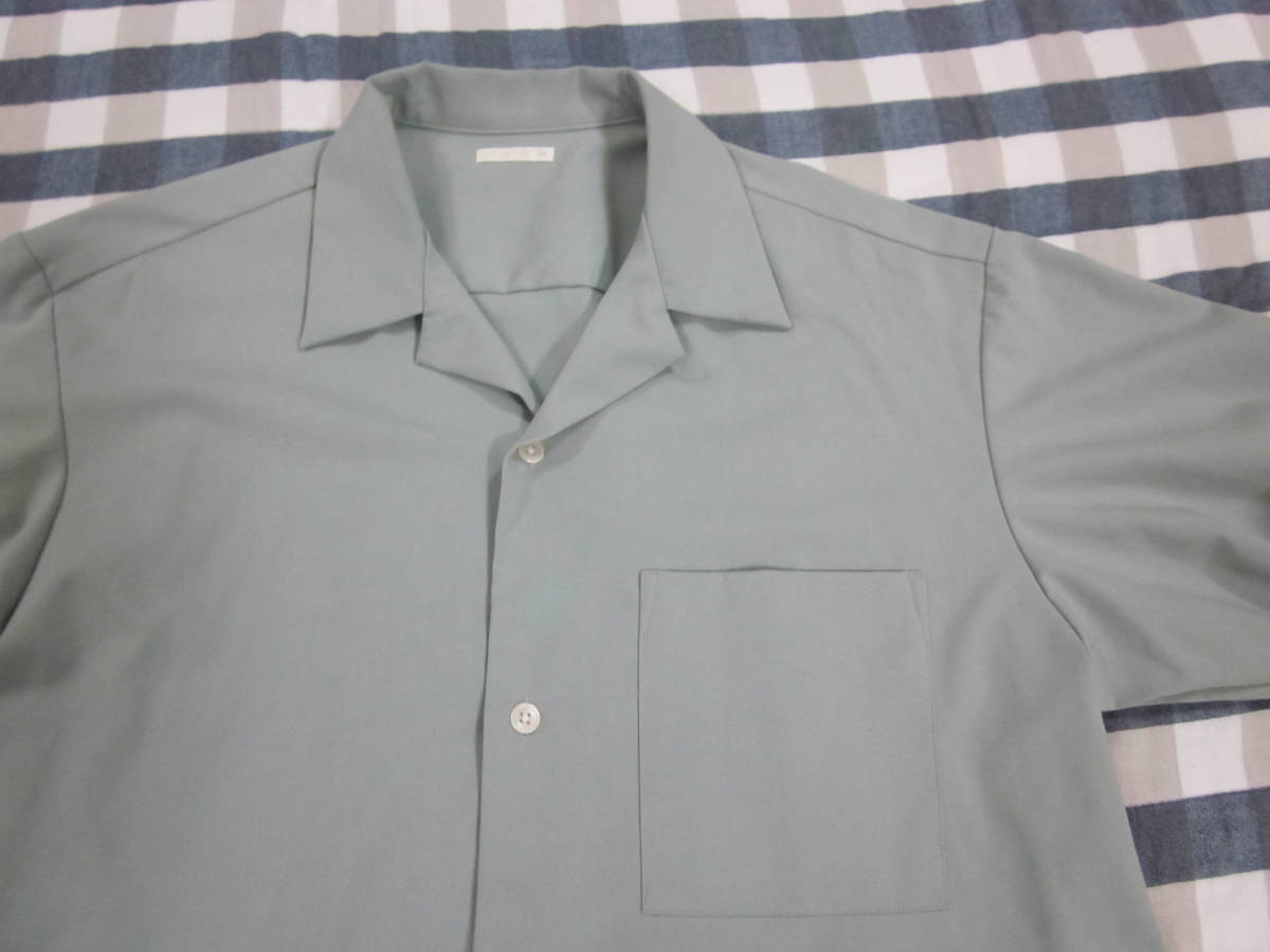 ■ GU 厚手の青磁色のメンズシャツジャケットMサイズ 素人採寸ですが 肩幅≒50cm、身幅≒54cm、袖丈≒59cm、着丈≒70cm 、ポリエステル62%