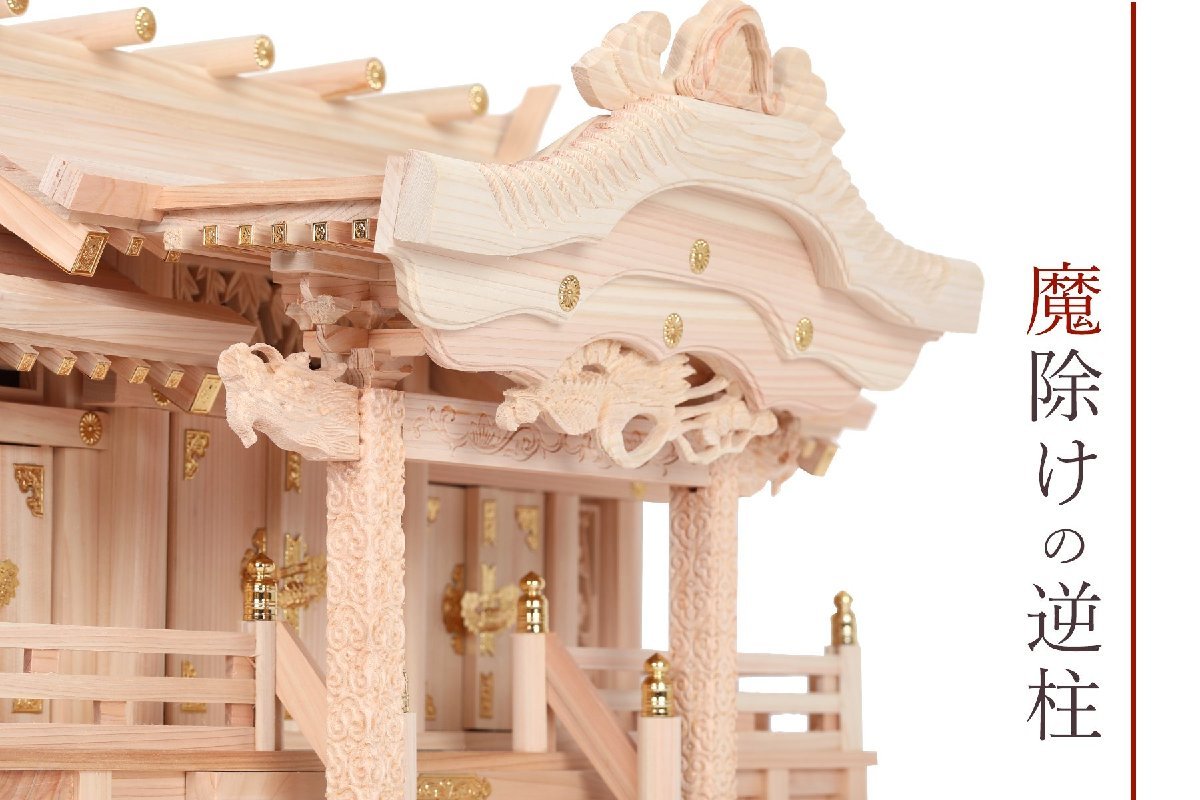 お待たせいたしました、「やまこうオリジナル・昇龍大社」が入荷いたしました。真鍮金具で彩りされたお社は「グリ紋」の仕様、限定台数の発売となります。 阿吽の龍柱には、日光東照宮の陽明門にあやかった「グリ紋・魔除けの逆柱」があしらってあります。 「満つれば欠ける」の諺にちなみ、不完全な柱(逆柱)をあえて社殿に取り付けることにより、永遠不朽の平穏を祈願いたします。お社の金具は真鍮とアルミ合金製、プラスチックを使わない、高級神棚ならではの装飾となっています。 |
