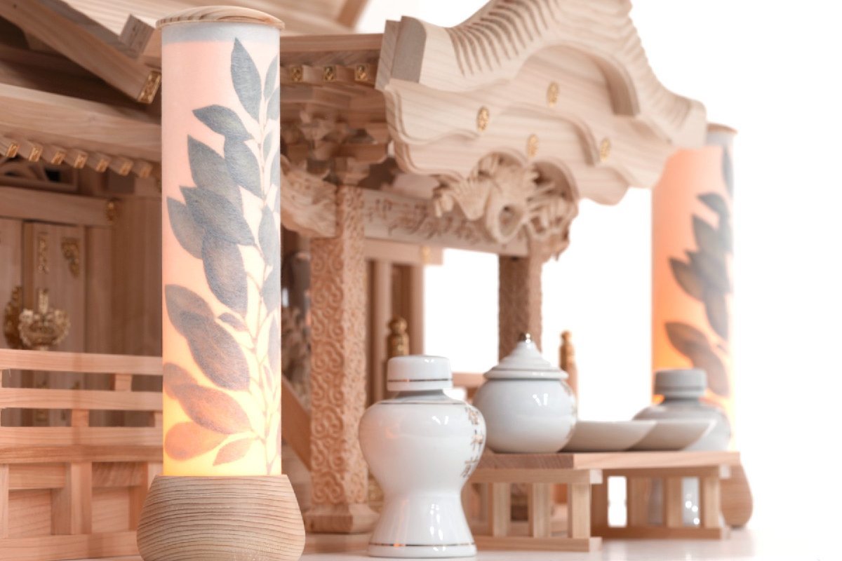 透かし彫り欄間もしつらえ、檜の香りと併せて厳かな雰囲気を醸しています。存在感のある神棚をお探しの方にもお勧めですお社の底面からお神札を簡単に収めることができます。大型のお神札にも対応します。 神具セットには明かりが灯るお供え榊、「榊灯」が付属します。スイッチを入れると、ほんのりとした明かりが灯り、拝殿の優しいひと時を演出してくれます。明かりを灯さなくても和モダンの趣き、添えれば神棚全体がインテリアに溶け込む不思議なアイテム。台座と上蓋は国産の桧無垢材、木の風合いは一層やさしく、豪華に。陶器のセットは金文字「御神前」の塗りが施され、豪華な雰囲気を醸しています。 |