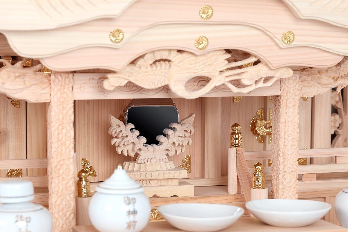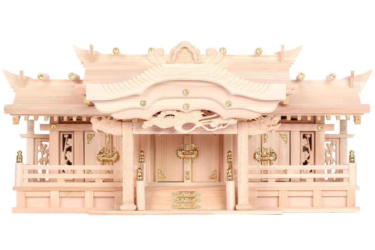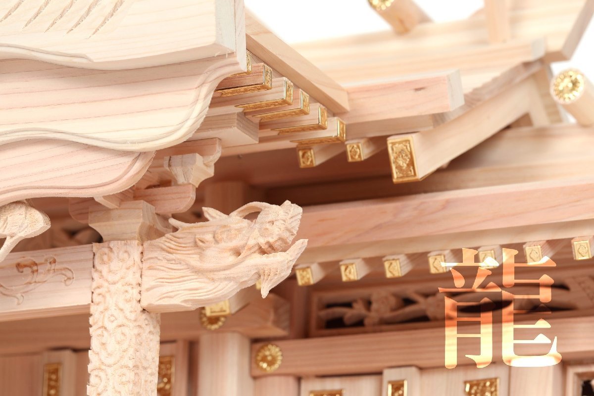 横幅は84cmと大型の神棚ですが、高さは37cmとやや抑えた低床形となります。拝殿唐破風の様式で作られた美しい屋根が魅力の社。細微な彫りで作られる装飾と大変立体的な構造、見ていて飽きのこない神棚となっています。 |