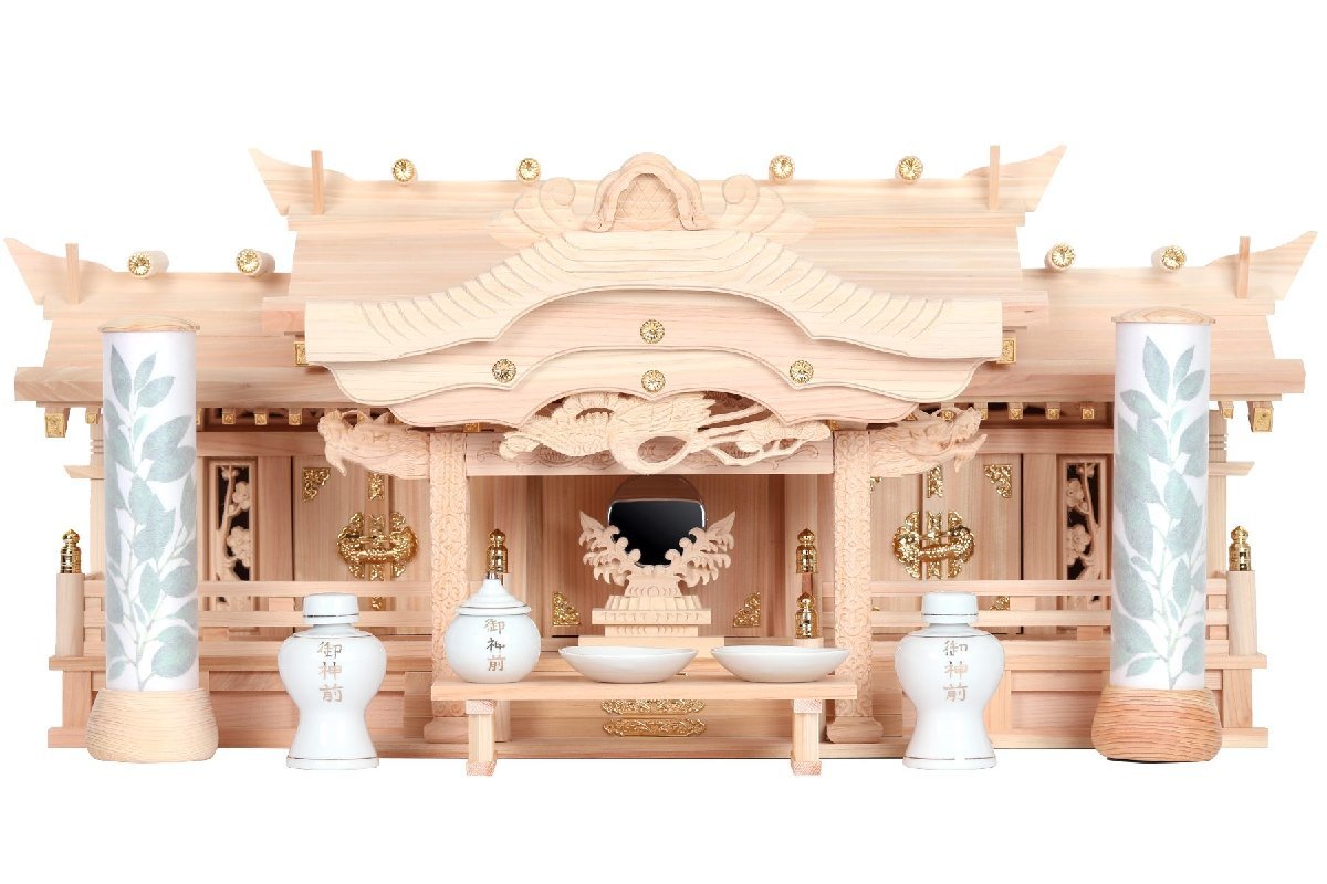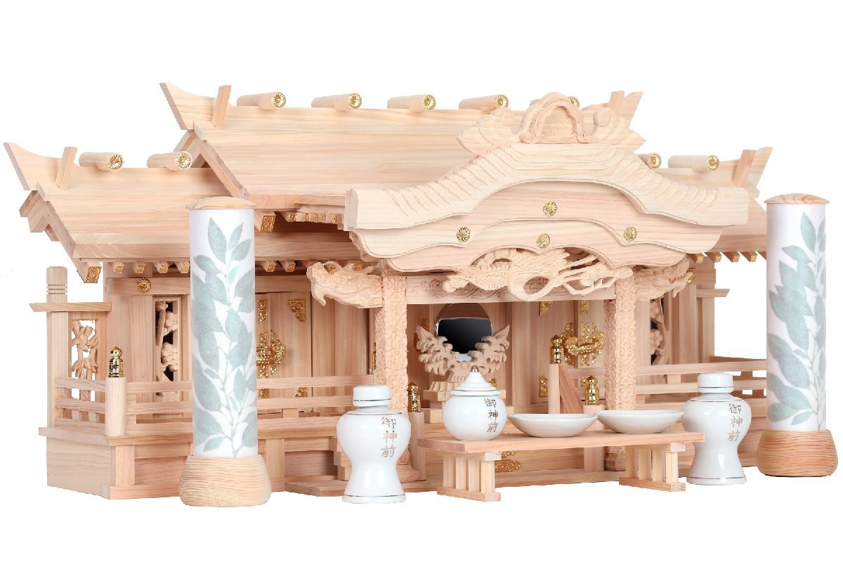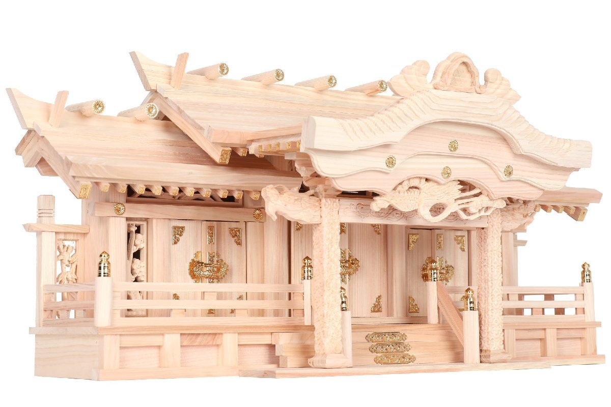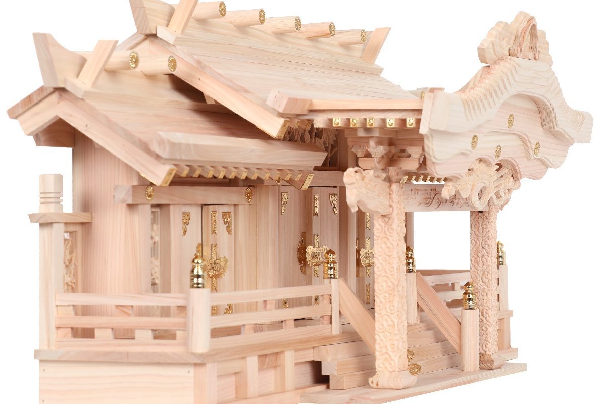 横幅は84cmと大型の神棚ですが、高さは37cmとやや抑えた低床形となります。拝殿唐破風の様式で作られた美しい屋根が魅力の社。細微な彫りで作られる装飾と大変立体的な構造、見ていて飽きのこない神棚となっています。 |