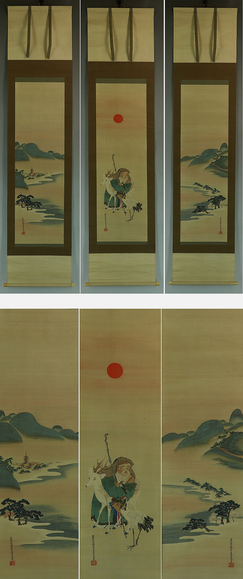 | №2209128【真作】土佐光貞【三対幅・慶祝図】◆絹本◆合箱◆掛軸 | |