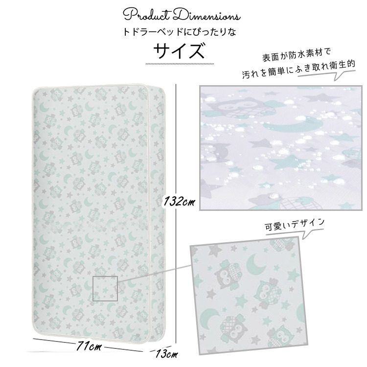 | 仕様 | 海外基準、当店販売中のトドラーベッドに適合サイズ 耐久性・耐熱性のあるスチールコイル80個でお子様の体を支え快適な睡眠を提供。 ラミネート加工の特殊縫製により、マットレス内へのアレルゲンやバクテリアの侵入を抑制 もしもの時にも、表面が防水素材のため汚れを簡単にふき取れ衛生的! |