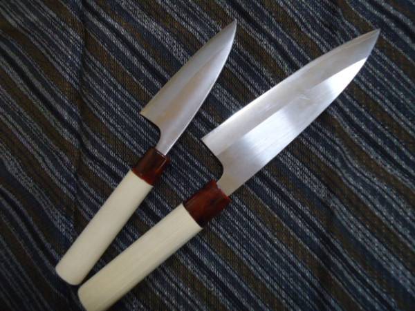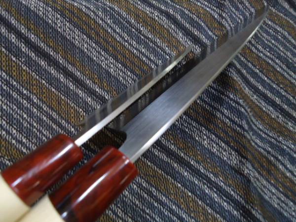 ご面倒でも必ず注意事項等お読みの上、ご入札下さい。 入札・落札後のお申し出は承れません。 大変使い易く、良く切れます! 小包丁はちょっと料理や小魚調理に便利!硬質ステンレス割込み、三層包丁。 錆びずに切れます! 左近白梅作包丁 両刃 割込 和包丁 さびないこと、切れ味の良いこと、研ぎやすいことこれら全てを充たす 和包丁の極みです。包丁の種類は、用途に応じた厚さに仕上げられています。 高い硬度と耐摩耗性ー鋼部に使用されている、耐摩耗性にも極めて優れており。 本製品はaus8に軟質ステンレスを重ねた三層クラッド材を使用し、最良の切れ味と硬度をもっています。 サイズ 全長 300・235mm 刃渡 165・105mm 刃幅 47・38mm 刃厚 2mm 重量 100・69g | |