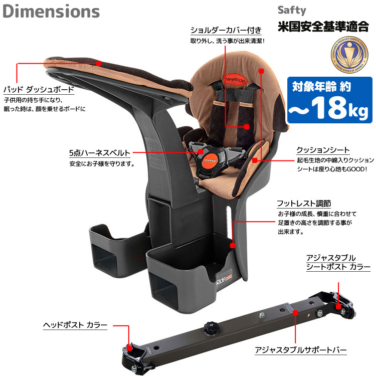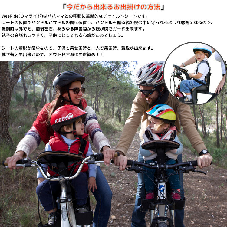| 仕様 | パパママの腕の間に座る事ができ、お話も弾む! 自転車でのお出掛けが変わります!! 前後左右の障害物から、お子様をガードする事ができ、 アウトドア派の家族にぴったり! シートの着脱が簡単なので、パパママ間の自転車の移動も出来ます。 (※別売り:サポートバーを2台目に取り付けでさらに快適です。) マウンテンバイクや、クロスバイク、電動自転車などほとんどの自転車に取付が出来ます。 成長に応じて、脚置きの高さを調節出来ます。 ロードレーサー(ドロップハンドルバー)には対応致しません。 シートクッションは取り外すことが出来ません。 サポートバーの上でシートをスライドさせ、適所で固定させます。 その際出来る限りハンドルから離して取り付ける様にしてください。 (ハンドルに近すぎると、ハンドルが十分に動きません) |