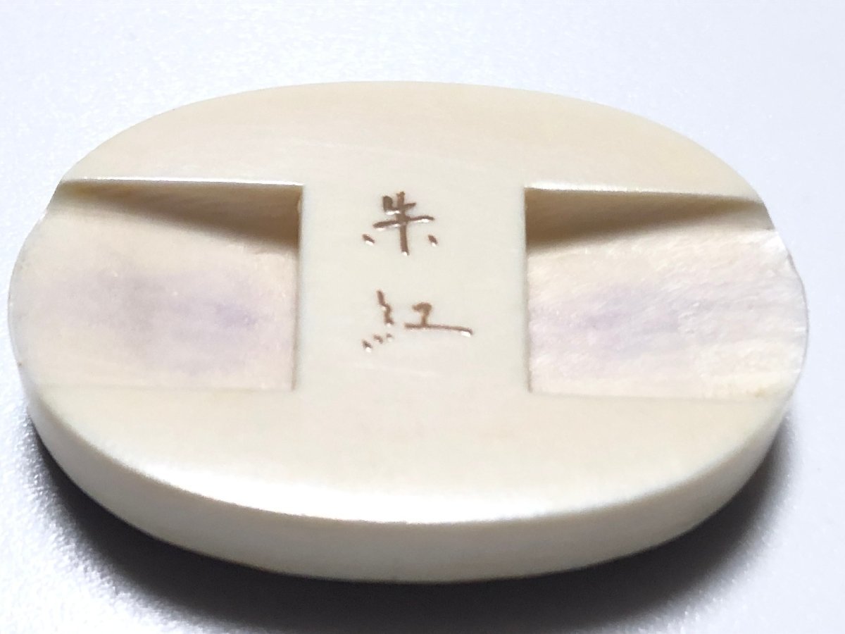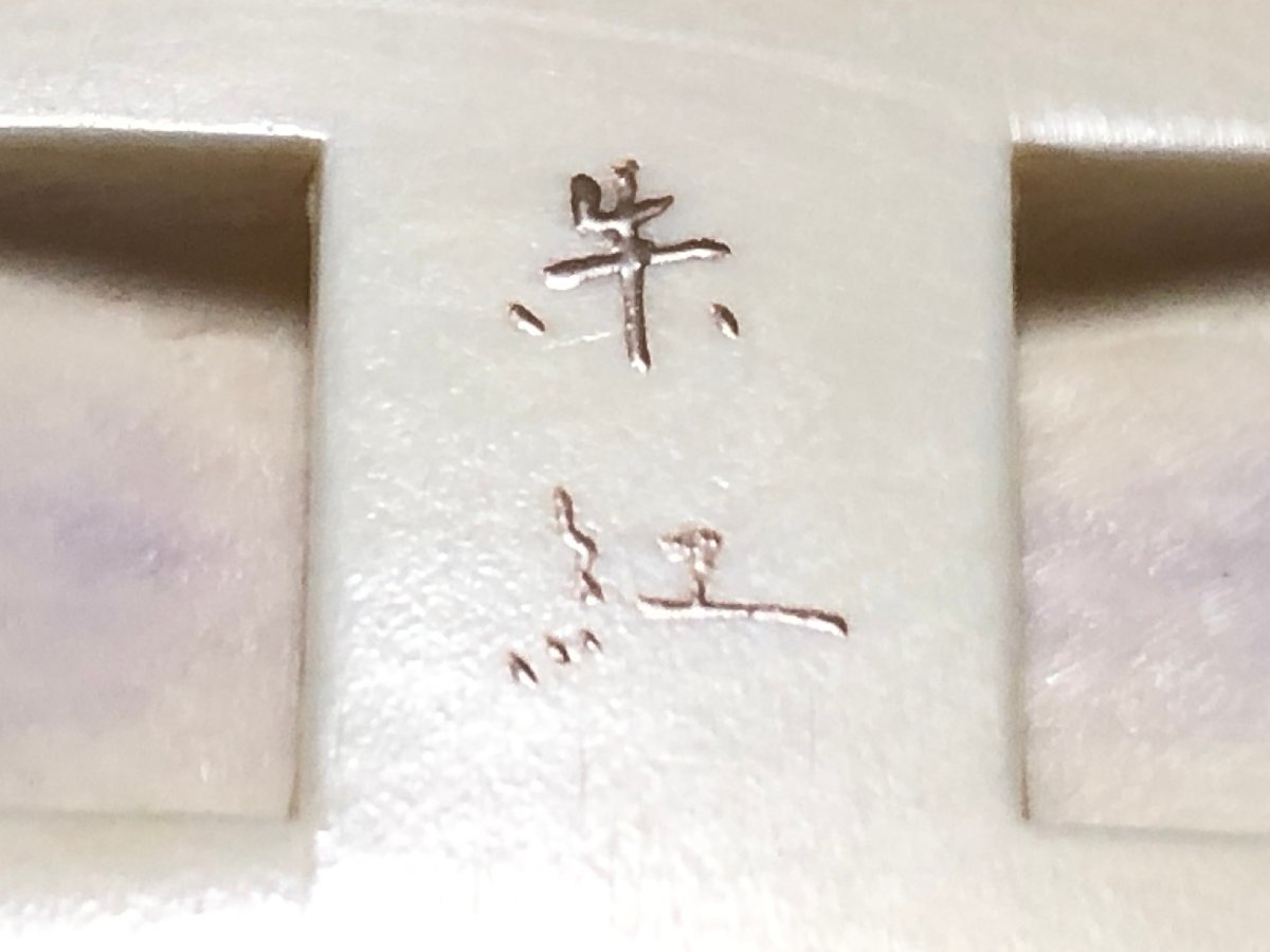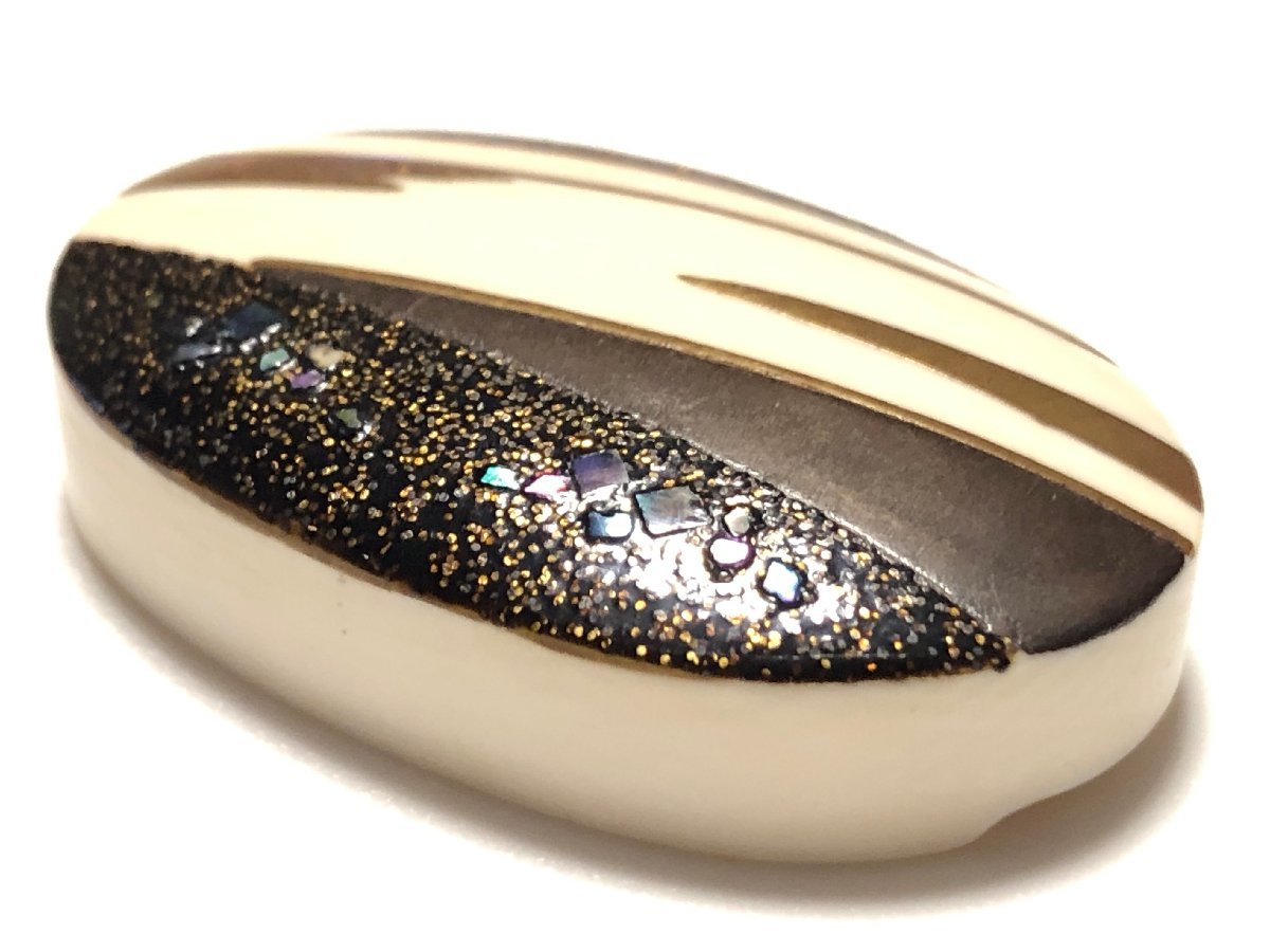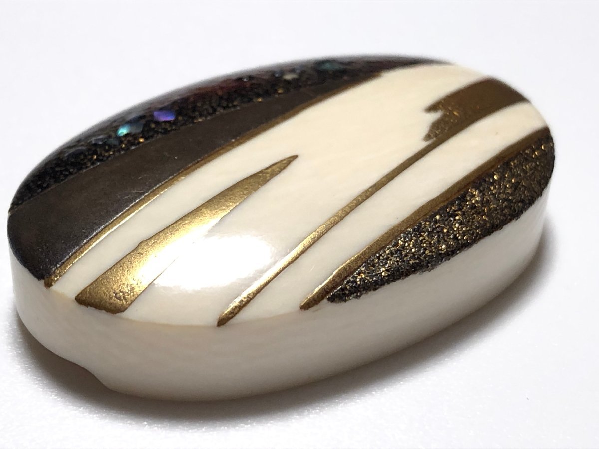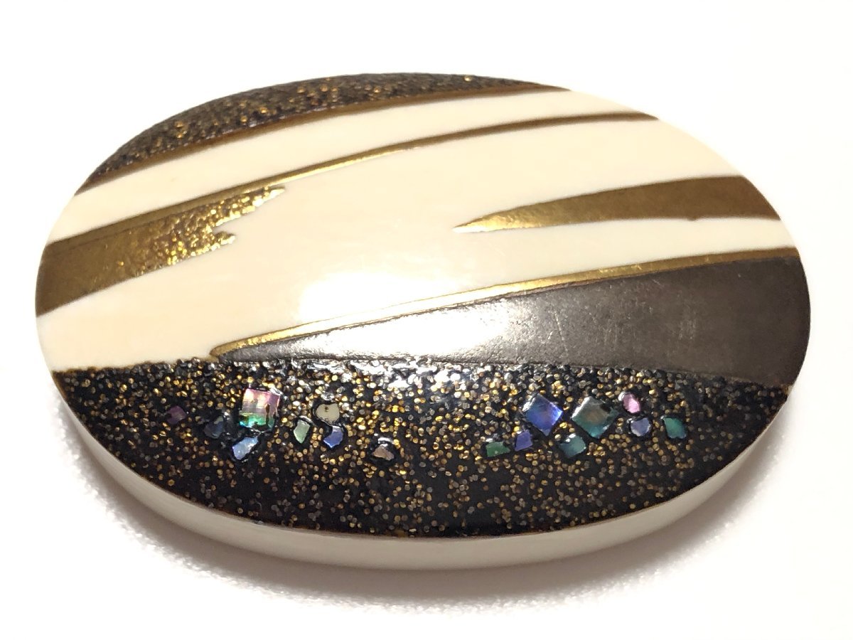 アンティークの金蒔絵・螺鈿を施した、デザイン帯留めです。作者、加賀蒔絵師・井尻朱紅の銘があります。気にならない程度ですが、裏面に1ヵ所小さな欠けがありまりす。