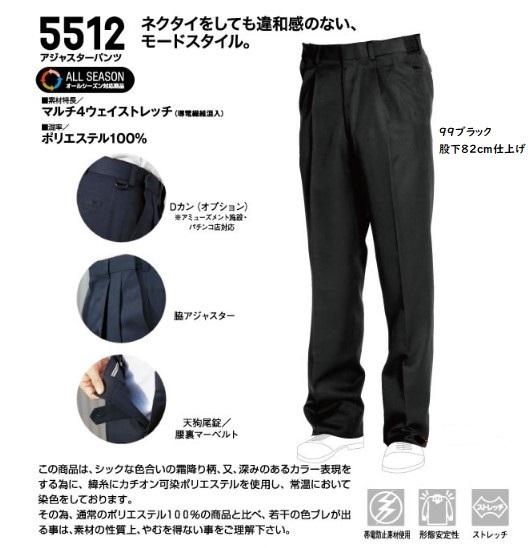 ネクタイをしても違和感の無い『モードスタイル』 帯電防止・形態安定性・ストレッチ ★色:99ブラック(こちらは裾仕上げ済) ★サイズ:7L(ウエスト118-124cm、股下82cm) ★素材:マルチ4ウェイストレッチ(導電繊維混入) ★混率:ポリエステル100% | |