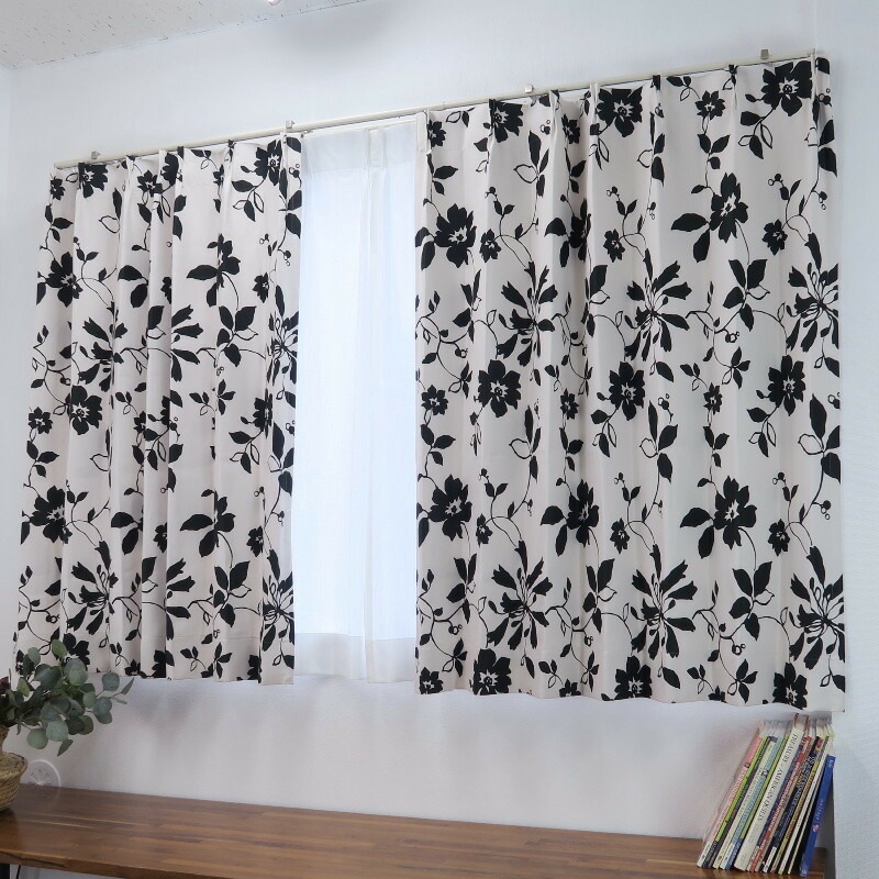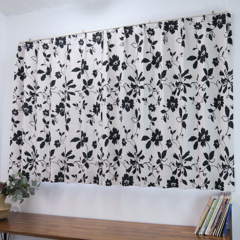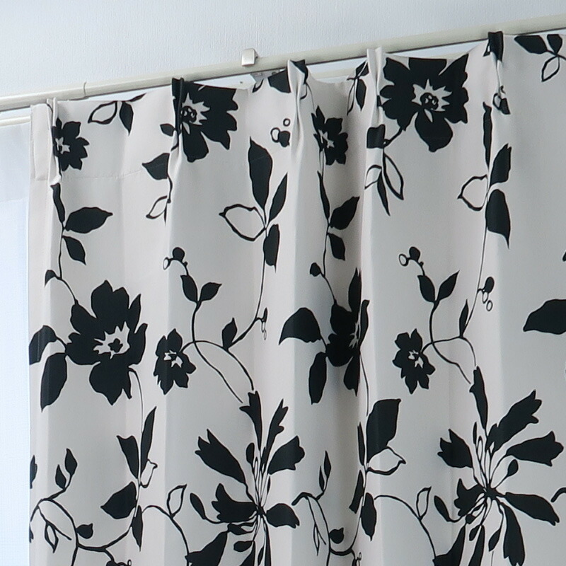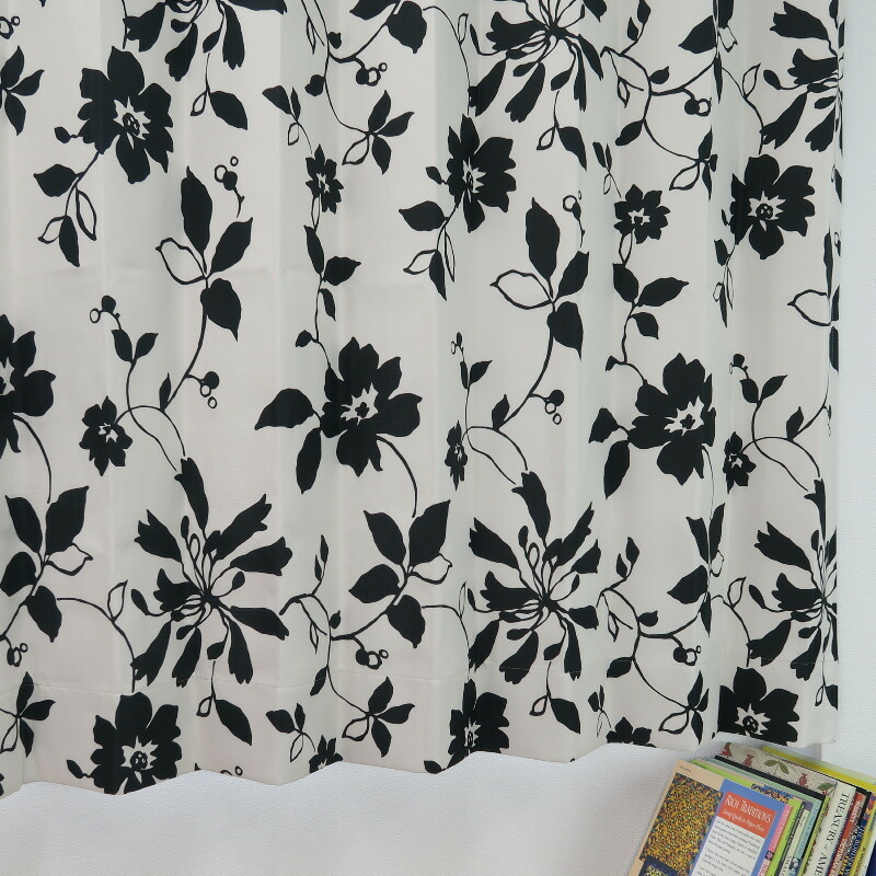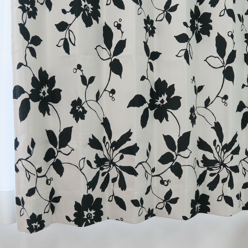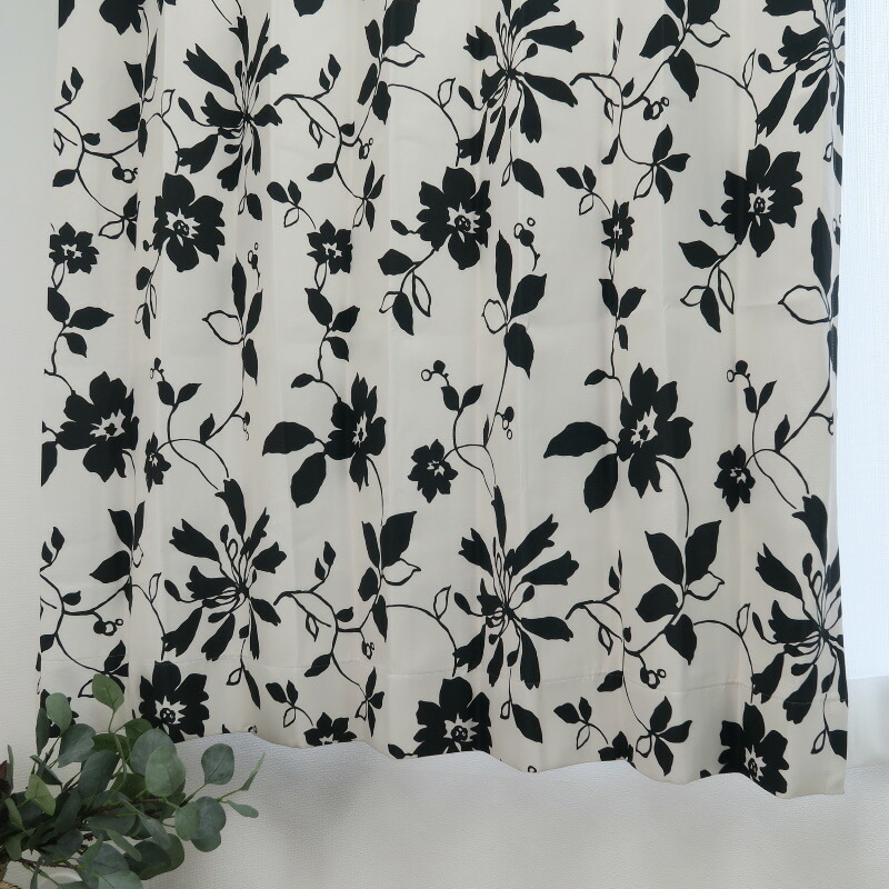 遮光カーテン 北欧 花柄 リーフ柄 ブラック 幅125cm×丈75cm2枚 日本製 プリーツが綺麗な形態安定加工