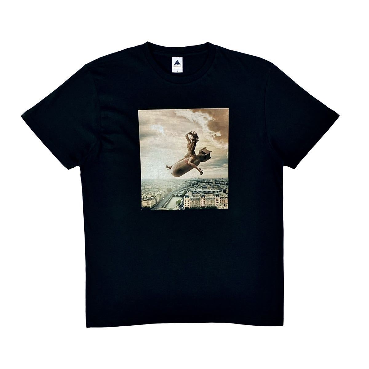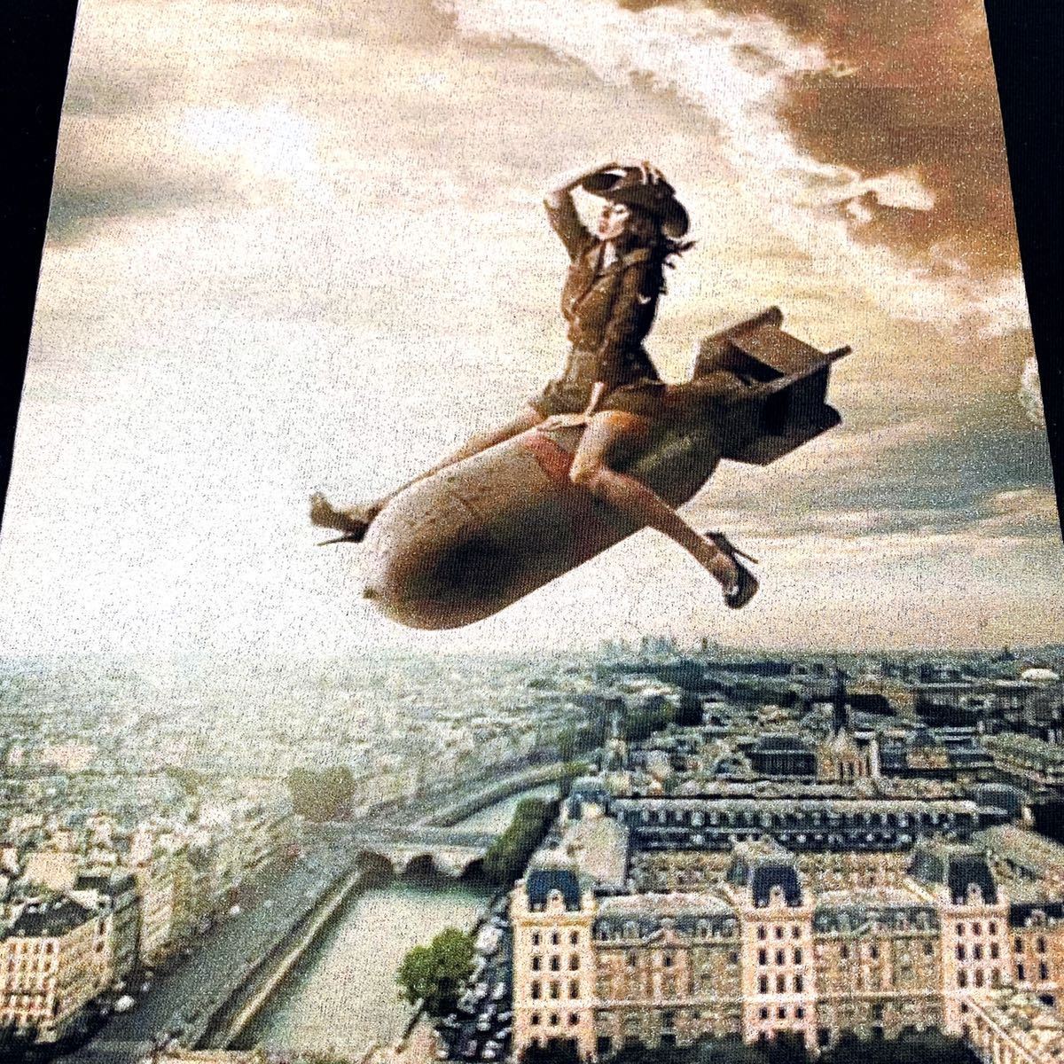 街の上空を爆弾に股がるミリタリーピンナップガールデザイン。