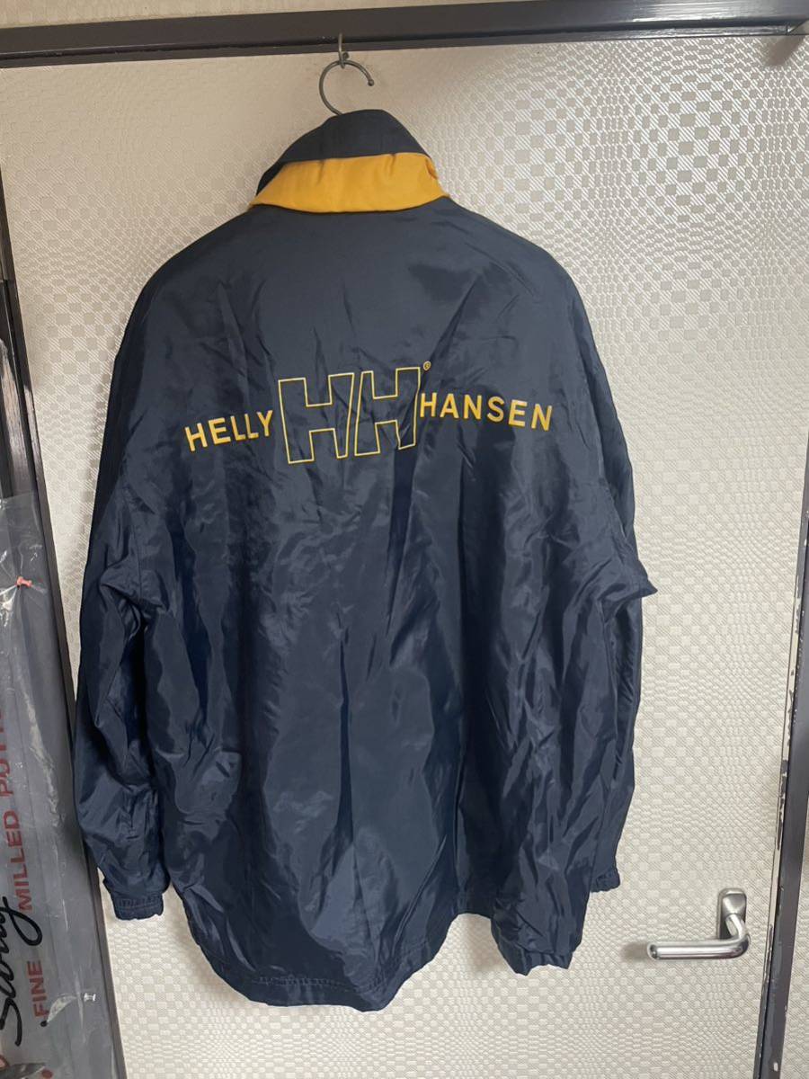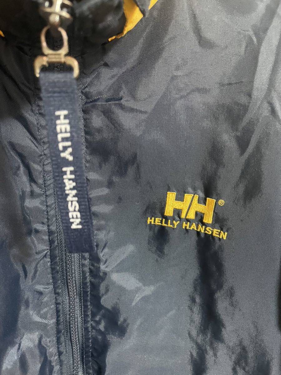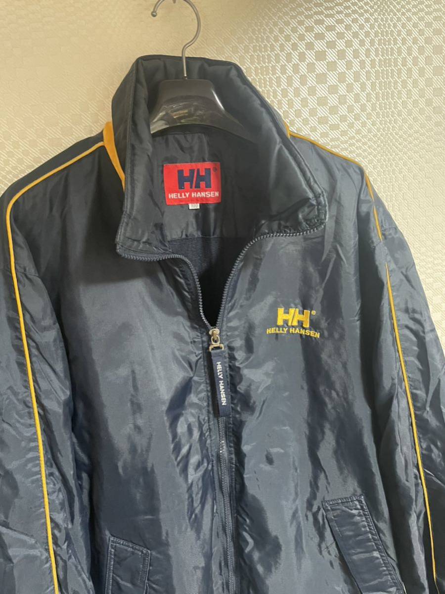 ヘリーハンセンのアウタージャケットです。襟元にフードが収納されています。サイズ100表記でXL位あります。平置き脇下身幅65着丈78肩幅55袖丈61センチ位です。裏地付きなので暖かいですよ。