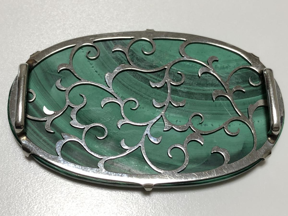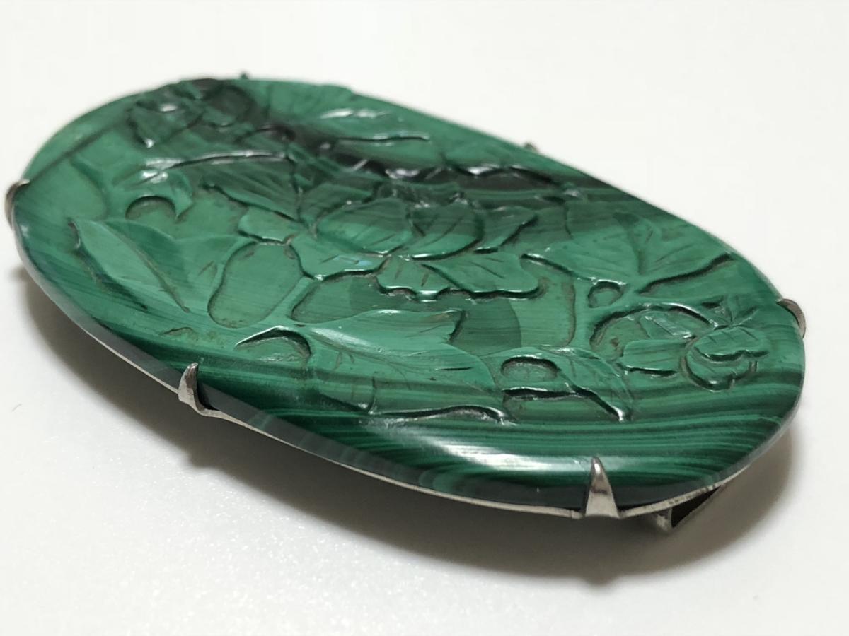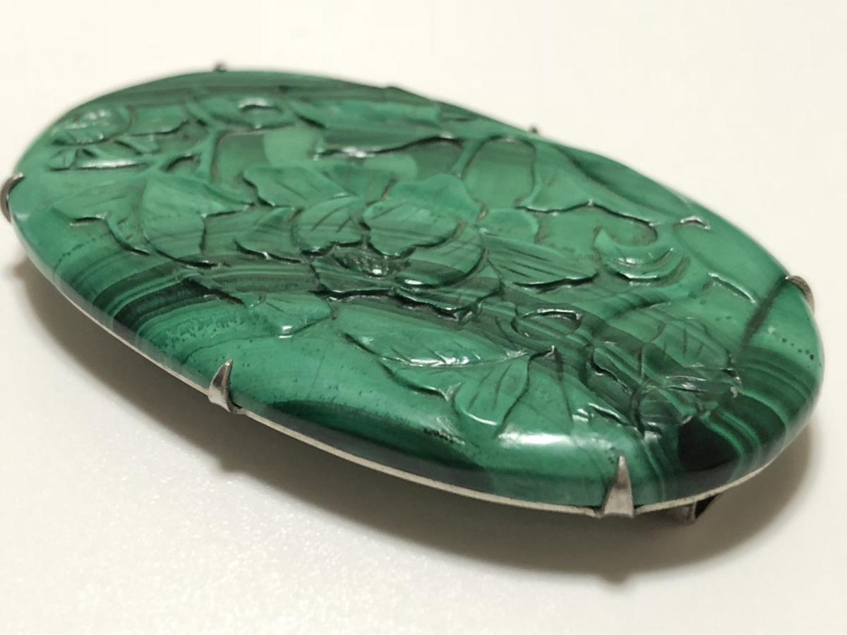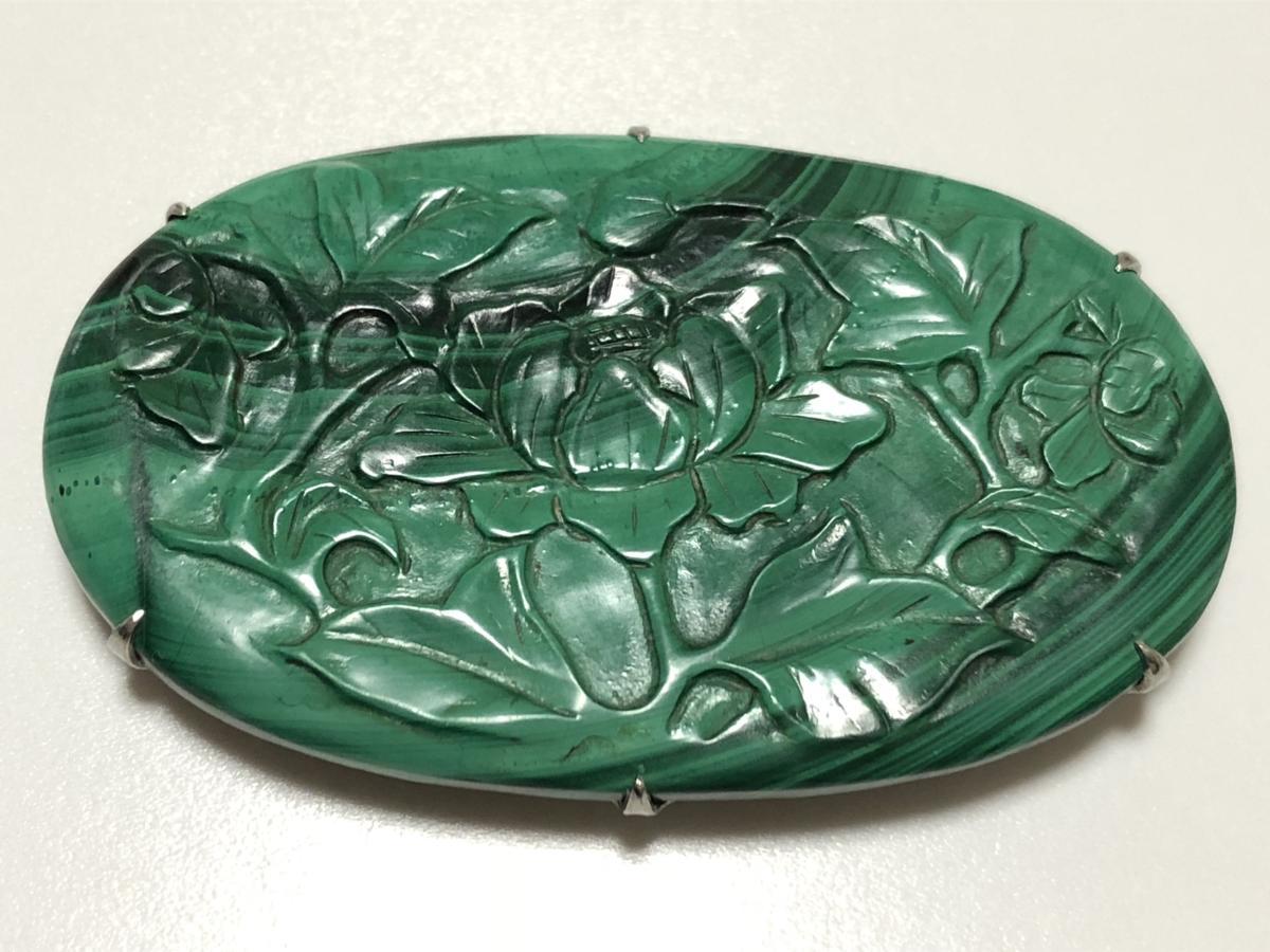アンティークのマラカイトを使用し、浮き彫りで牡丹細工を施した、大振りの帯留めです。 縦4.2㎝、横6.8㎝、重さ37.3g