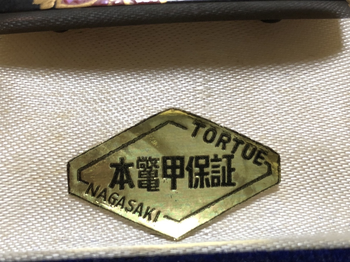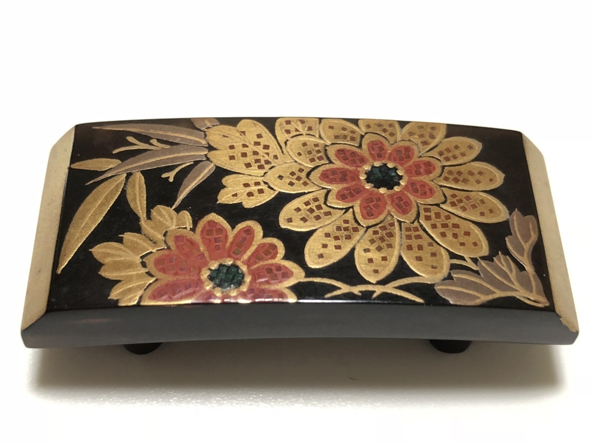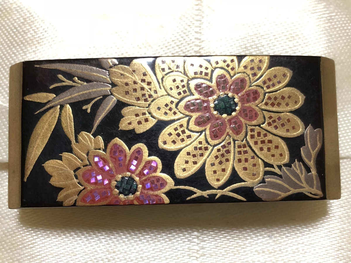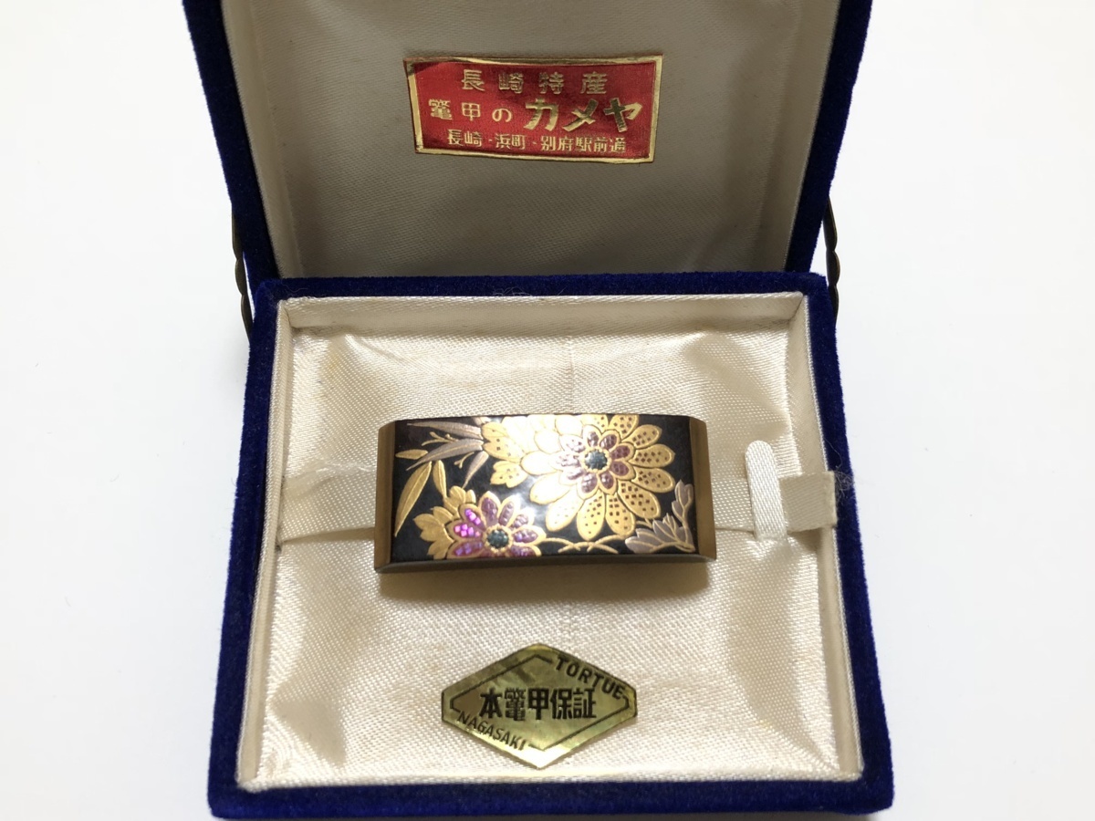 アンティーク、鼈甲のカメヤの本鼈甲を使用し、金蒔絵、螺鈿を施した、菊花文の帯留めです。作者の銘があります。鼈甲部分に欠けや虫食いは無く、美品です。ケース付属です。 縦2.1㎝、横4.8㎝、重さ8.3g