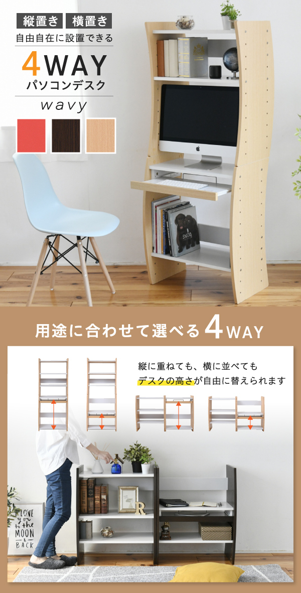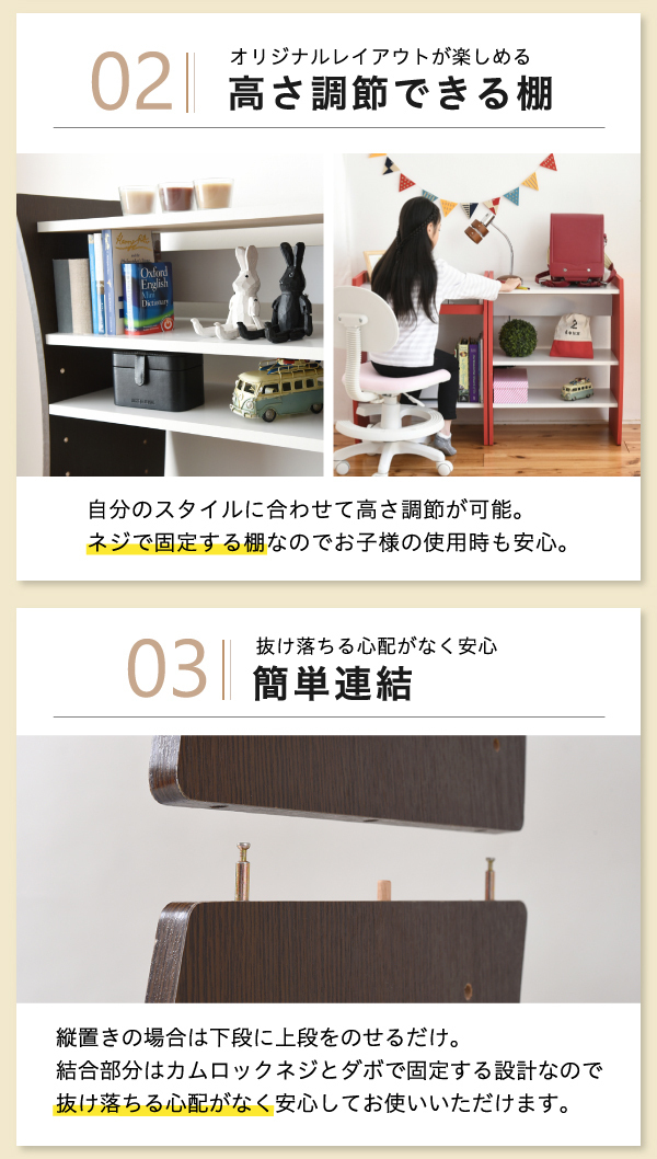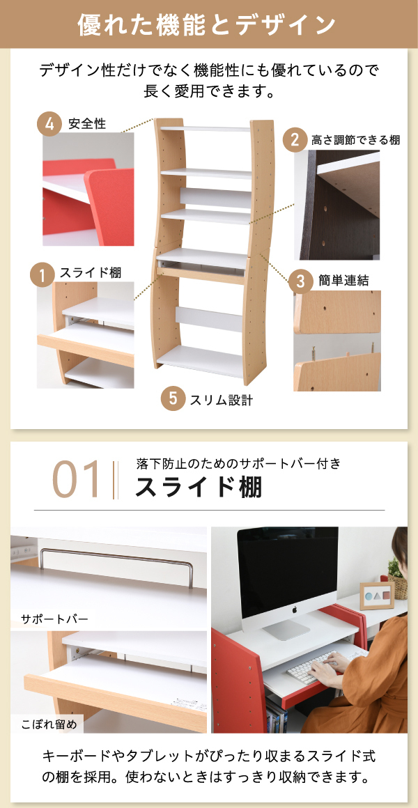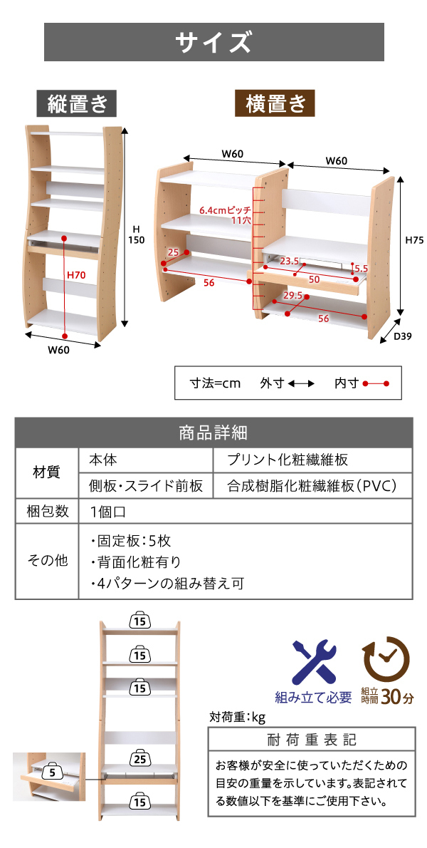 | 商品説明: | 好みに合わせて、イス仕様のハイタイプ、座仕様のロータイプに設定可能。 【商品仕様】 ■本体サイズ [外寸](縦置き)約幅60×奥行41×高さ150cm ■その他サイズ [内寸] (スライド棚)約幅50×奥行23.5×高さ5.5cm (スライド引き幅)14.5cm (可動棚)約幅56×奥行29.5×厚み1.8cm(6.4cmピッチ22穴) ■材質 [本体]プリント紙化粧繊維板 [側板・スライド前板]合成樹脂化粧パーティクルボード(PVC) ■耐荷重 [天板]約25kg以下 [スライド棚]約5kg以下 [棚板]各約15kg以下 ■備考 ・棚:5枚(組立時にお好みの位置で設置可能) ・背面化粧あり ■生産国 中国 ■組立時間(目安)(大人2人) お客様組立(30分) ■キーワード パソコン台 パソコンラック PCラック 高さ80 幅60 奥行39 PCデスク 学習机 机 PCローデスク ノートパソコンデスク PC机 PC台 パソコンテーブル パソコン机 パソコン用デスク 薄型デスク ハイデスク ローデスク ユニットデスク スタッキング 積み重ね 高さ調整 組み合わせ 木製 白 ダークブラウン 茶色 レッド おしゃれ |