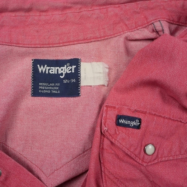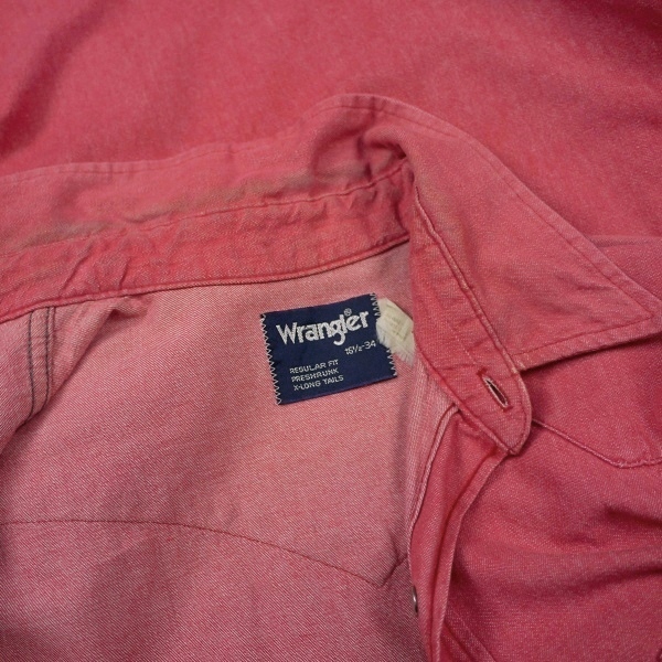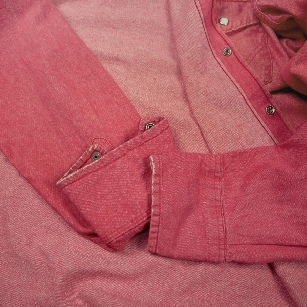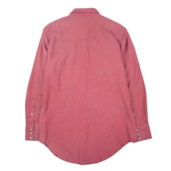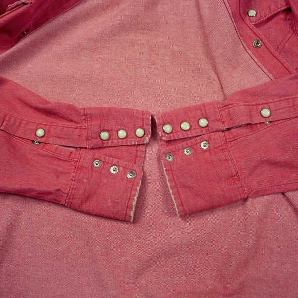 ・WRANGLER、MADE IN USA、100%COTTON、 ・アメリカで購入したラングラーのデニムウェスタンシャツです。 1980年代-1990年代、アメリカ製、薄赤色、 人気のビッグサイズ&レアカラーのレッドデニムタイプになります。 -------------------------------------------------------------------------------------------- ・状態は全体的に色落ち、あたり、 首元に薄汚れ、台襟角に擦れ、袖先フチに擦り切れあり。 上記のように使用感はございますが、 ビンテージアイテムならでは雰囲気ある色味&表情に仕上がっております。 -------------------------------------------------------------------------------------------- ・サイズ表記 16.1/2-34 (着用感XL位 *実寸参考下さい) 着丈前 77cm 着丈後 81cm 肩幅 47cm 身幅 59cm 腰幅 54cm 脇袖丈 54cm 肩袖丈 62cm -------------------------------------------------------------------------------------------- ・商品の確認には細心の注意を払っておりますが、 傷や汚れの見落とし、実寸の誤差、色味に多少の違いが生じる場合がございます。 また、商品は洗濯やクリーニング、メンテナンスを施しておりますが、 中古品、ビンテージ-アンティークアイテムになりますので商品特性のご理解をお願いいたします。 ・長期連休など休日は予定が分かり次第 自己紹介欄に記載させていただきます。 ご不明な点がありましたら入札前にご質問下さい。a |