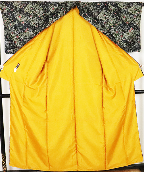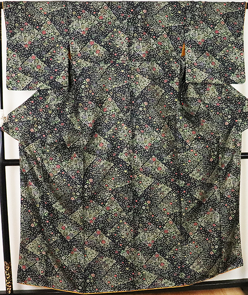 | 千都四季ブランド 小紋 袷 黒緑地鹿の子に花 163 広襟 L寸 カラー胴裏 新品 仕付け付き |