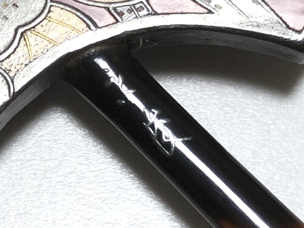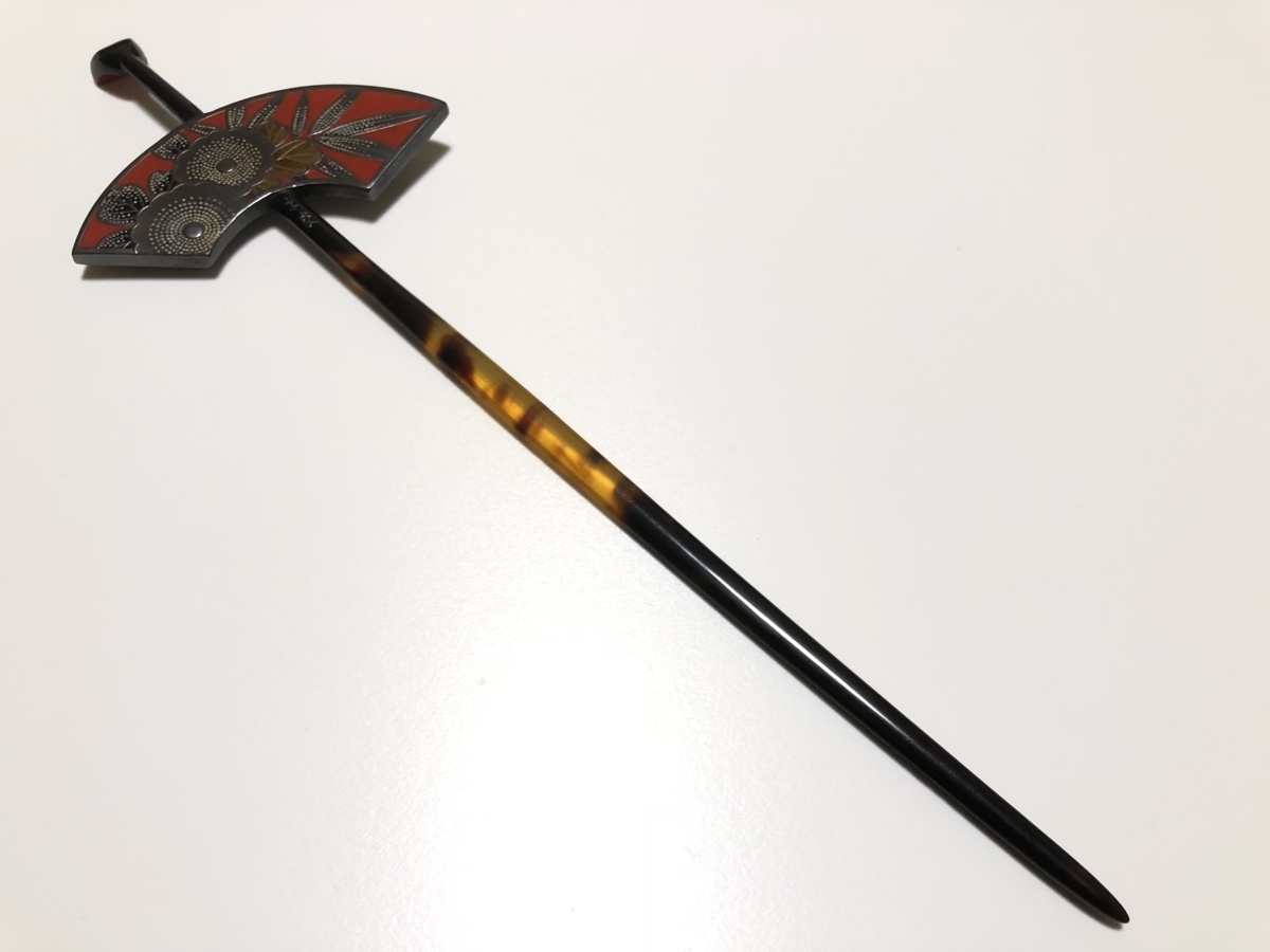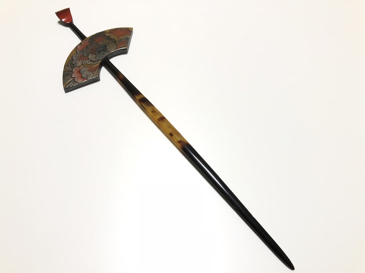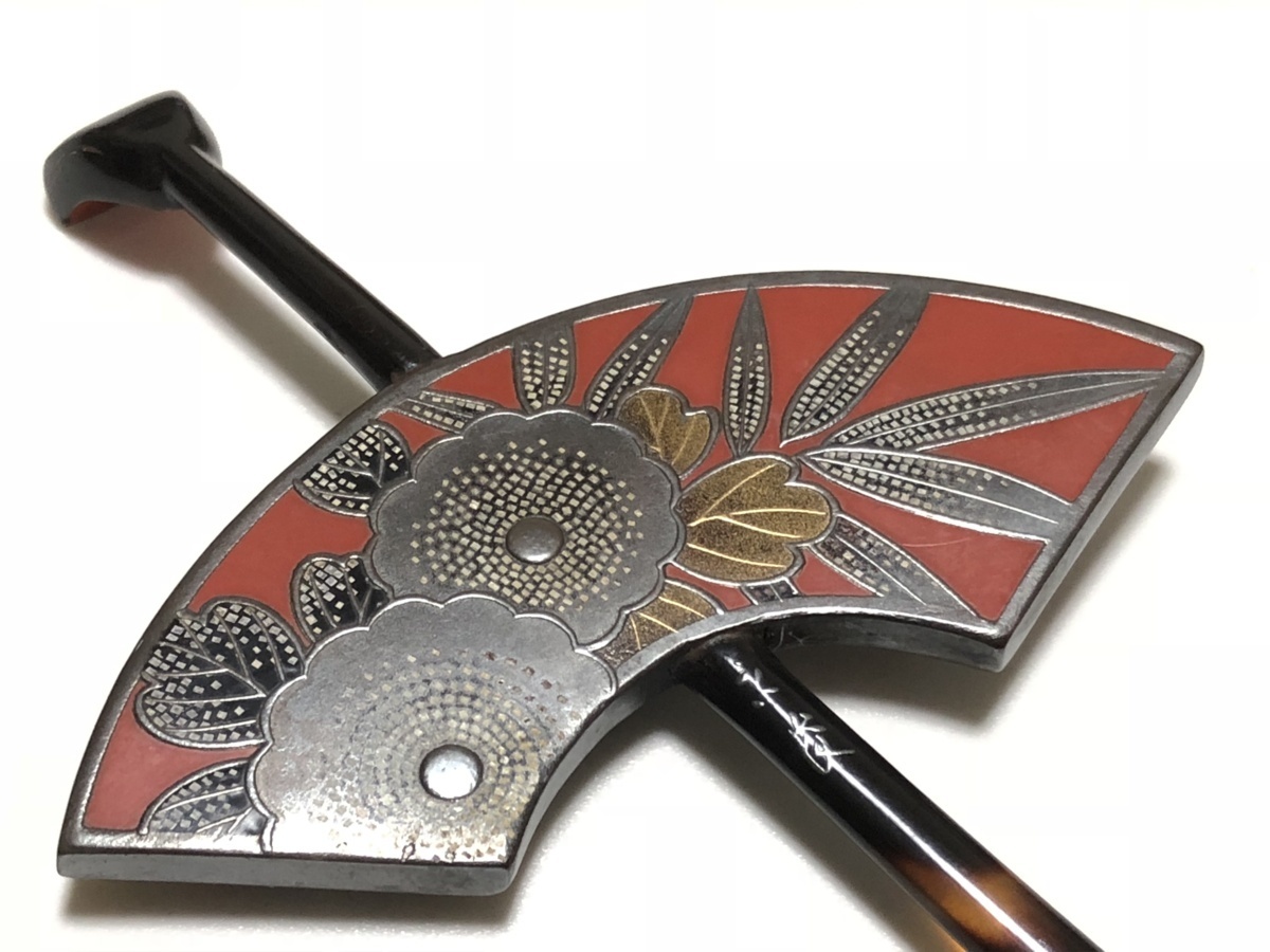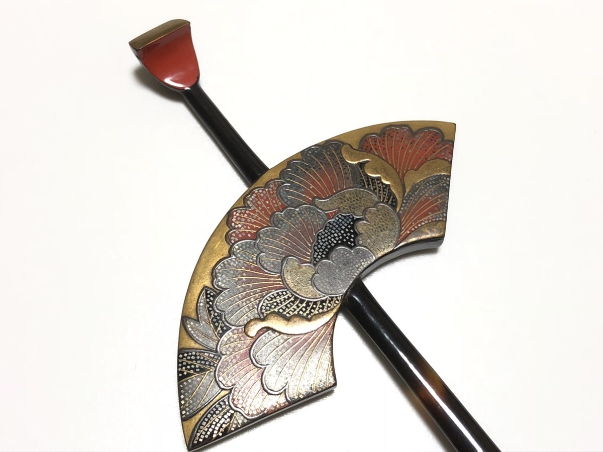 アンティークの本鼈甲を使用し、漆塗り、金蒔絵、螺鈿で扇面両面牡丹菊花文を施した、特大サイズの平打ち簪です。作者、永俊の銘があります。若干の虫食いがあります。 長さ24.5㎝、幅7.4㎝、重さ13.5g