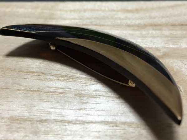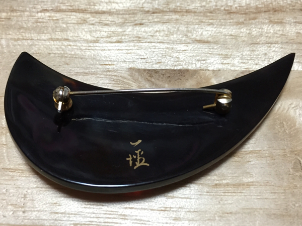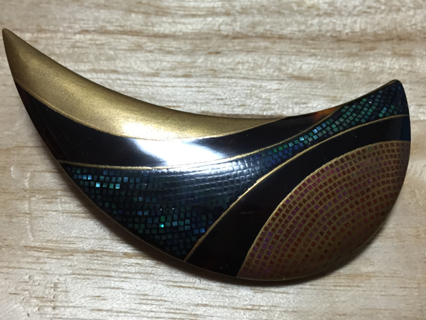 アンティークの本鼈甲を使用し、金蒔絵、螺鈿を施した、デザインブローチです。作者、寺内一径の銘があります。鼈甲部分に欠けや虫食いはありません。 縦4.0cm、横7.0cm、厚み0.7cm(金具含まず)、重さ7.2g