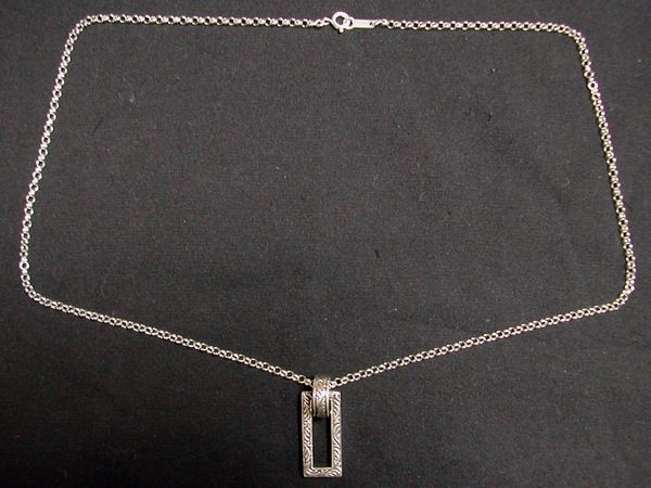 リングと四角のシルバーアクセサリーのトップが付いた銀のネックレスです。