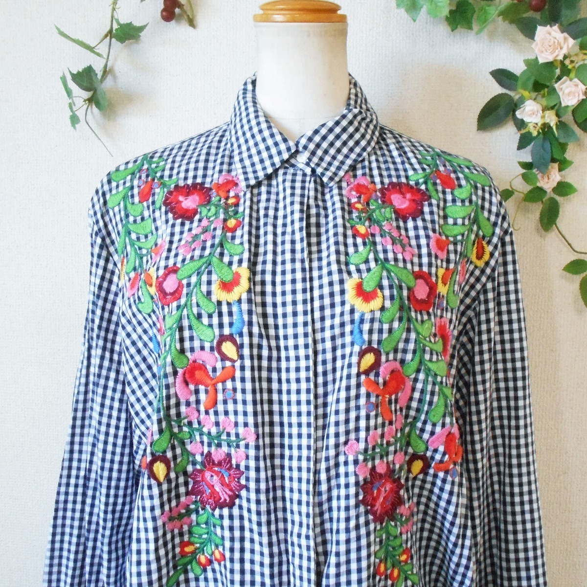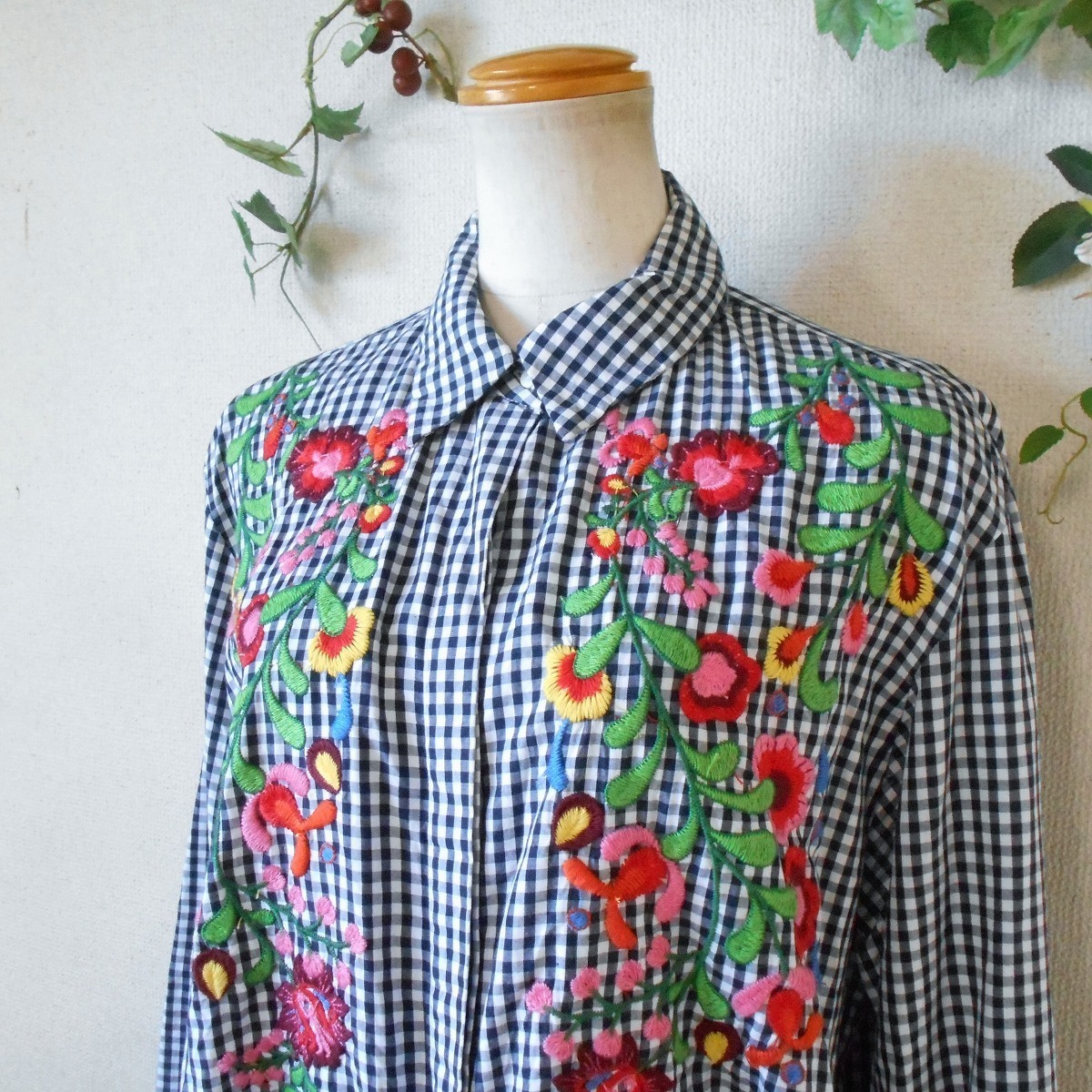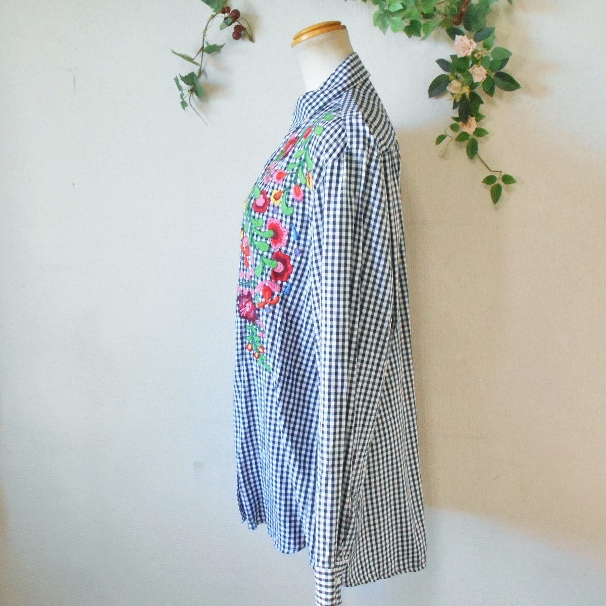 【ポイント】ザラウーマンの長袖シャツになります。お色は白黒のチェック柄ベースで前身頃にはカラフルな刺繍が入っています。