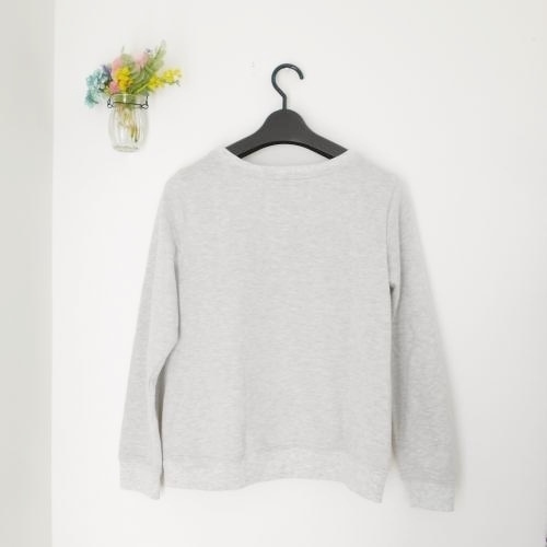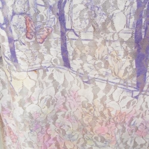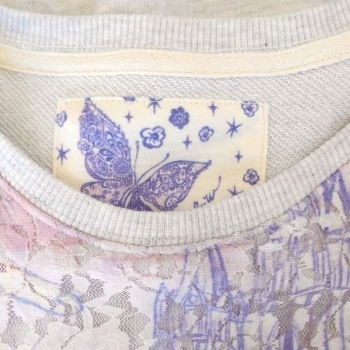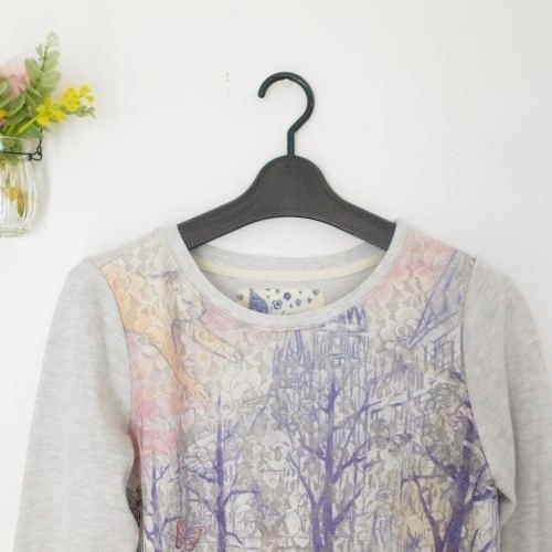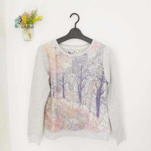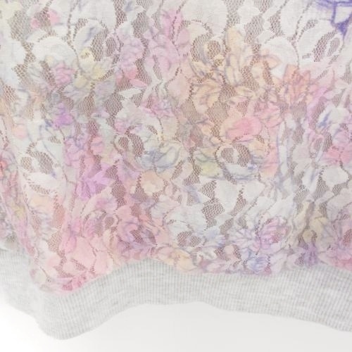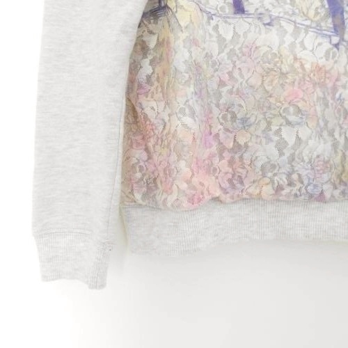 アロー ARROW レディース長袖トレーナーです。前はチュール素材で花柄や樹木が綺麗な一品です。お色は グレー地にピンクやパープルが使われています。Mですが少し小さめな感じです。実寸を参照下さいませ。