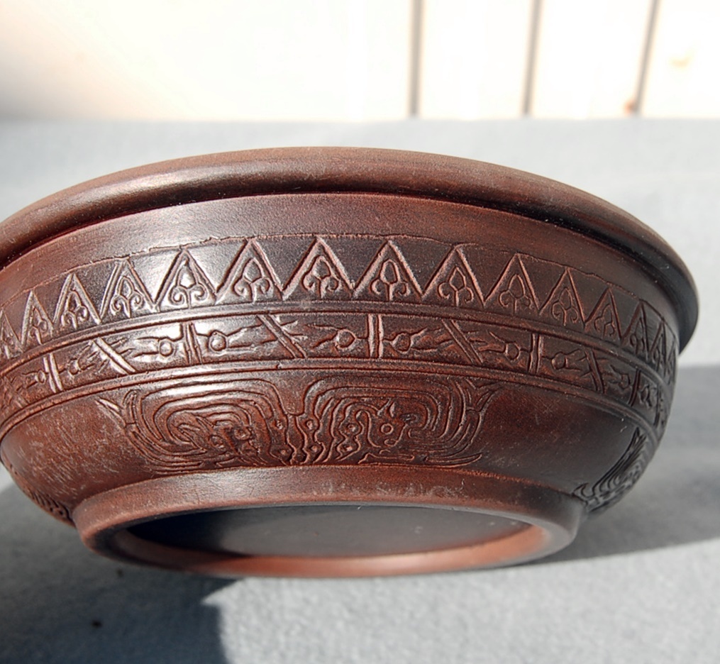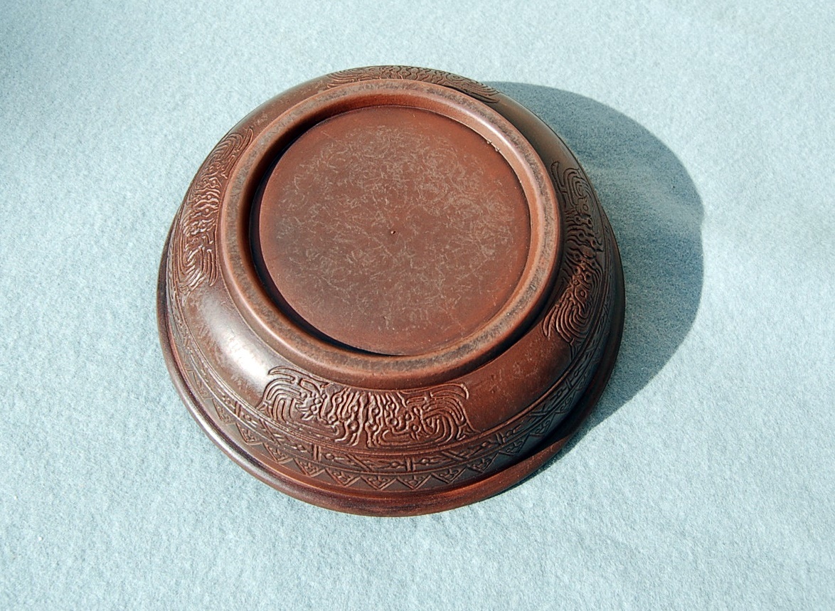 海外の時代品と思います。水盤にでも使用したのか丸い剣山を置いたような剥げ跡があります。