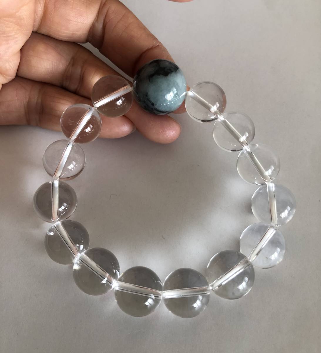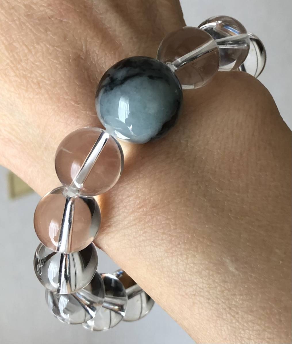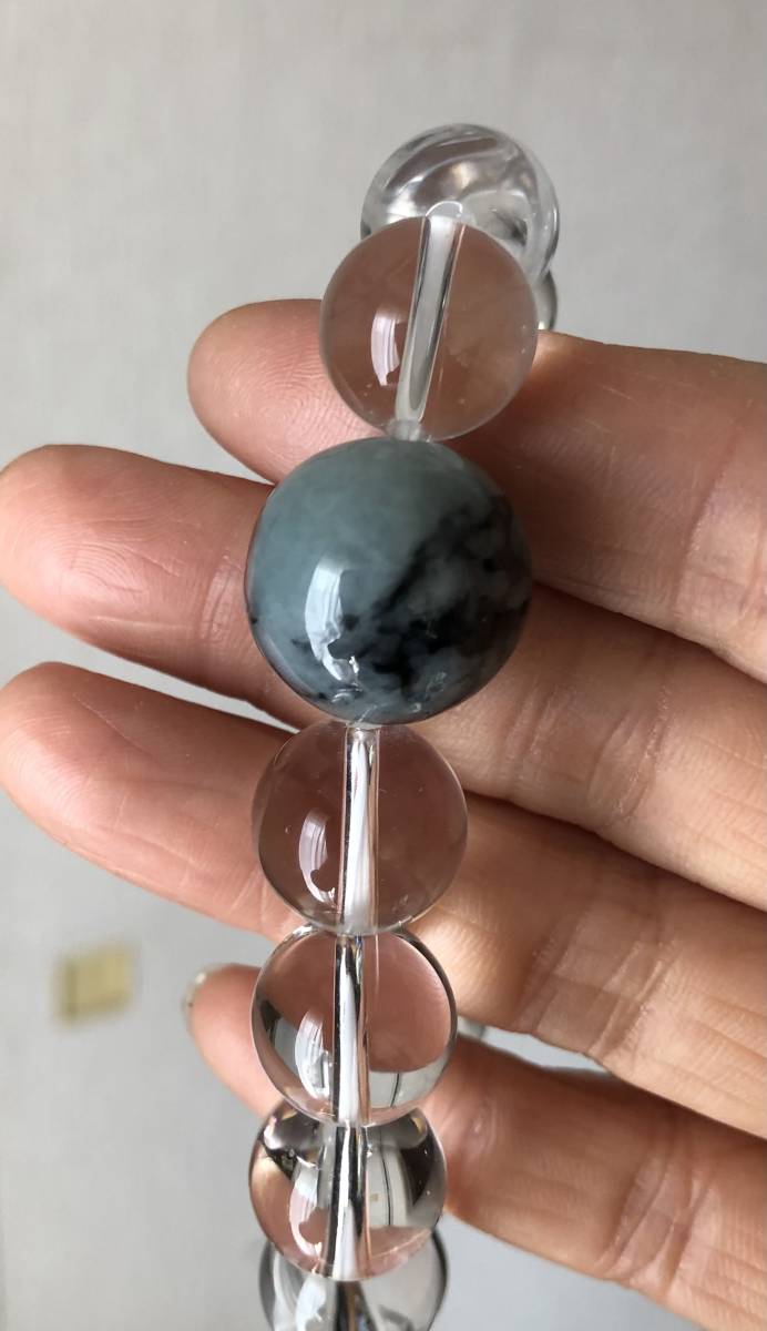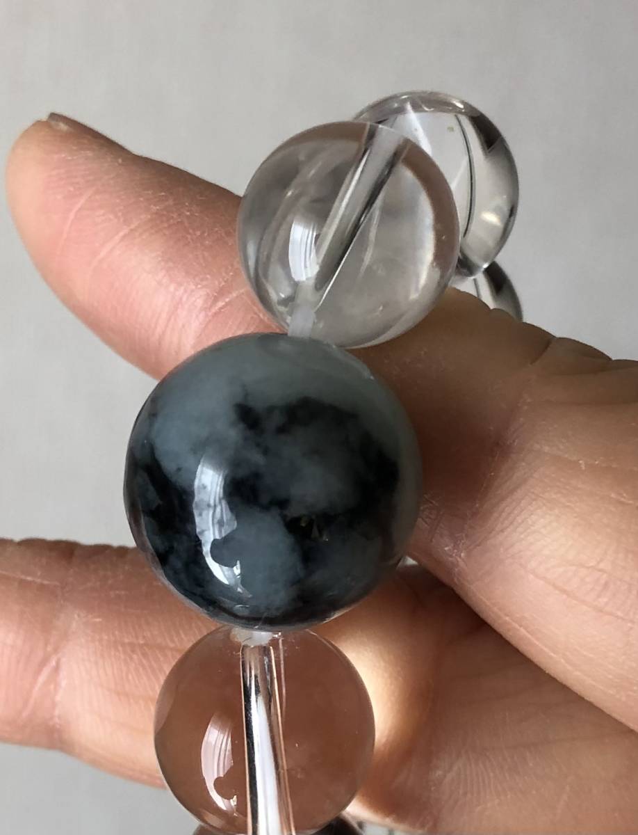 18ミリの本翡翠玉と14ミリの水晶で作られたブレスレットです。翡翠玉が白地に緑色、烏鶏種色を混ぜています、水晶と相性が良いです。