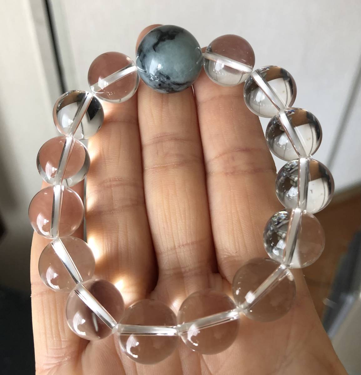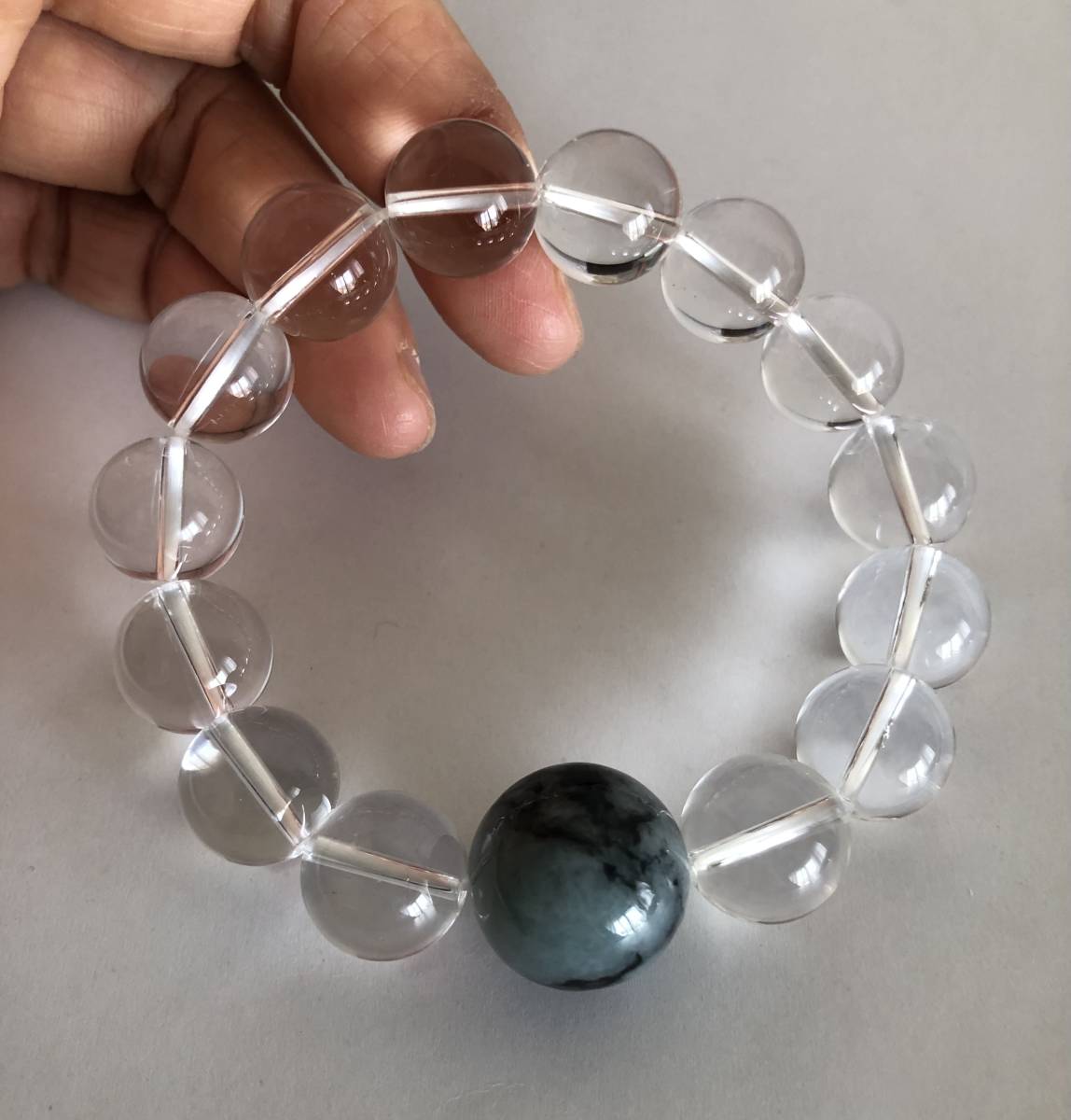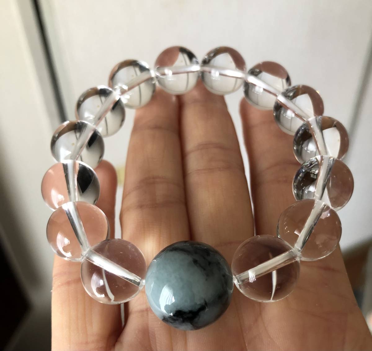 18ミリの本翡翠玉と14ミリの水晶で作られたブレスレットです。翡翠玉が白地に緑色、烏鶏種色を混ぜています、水晶と相性が良いです。