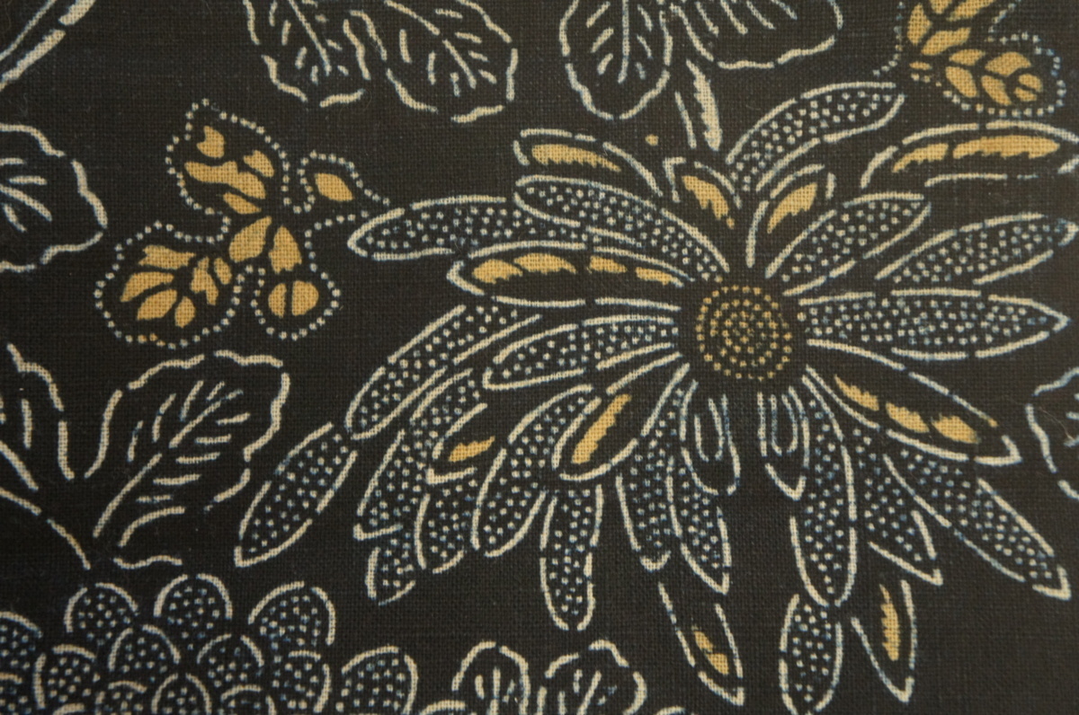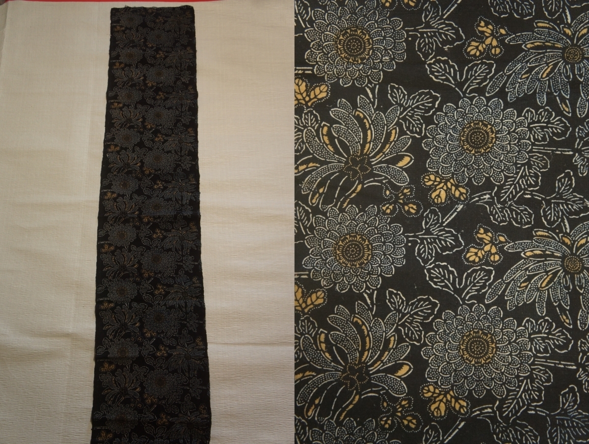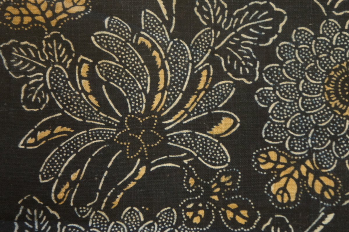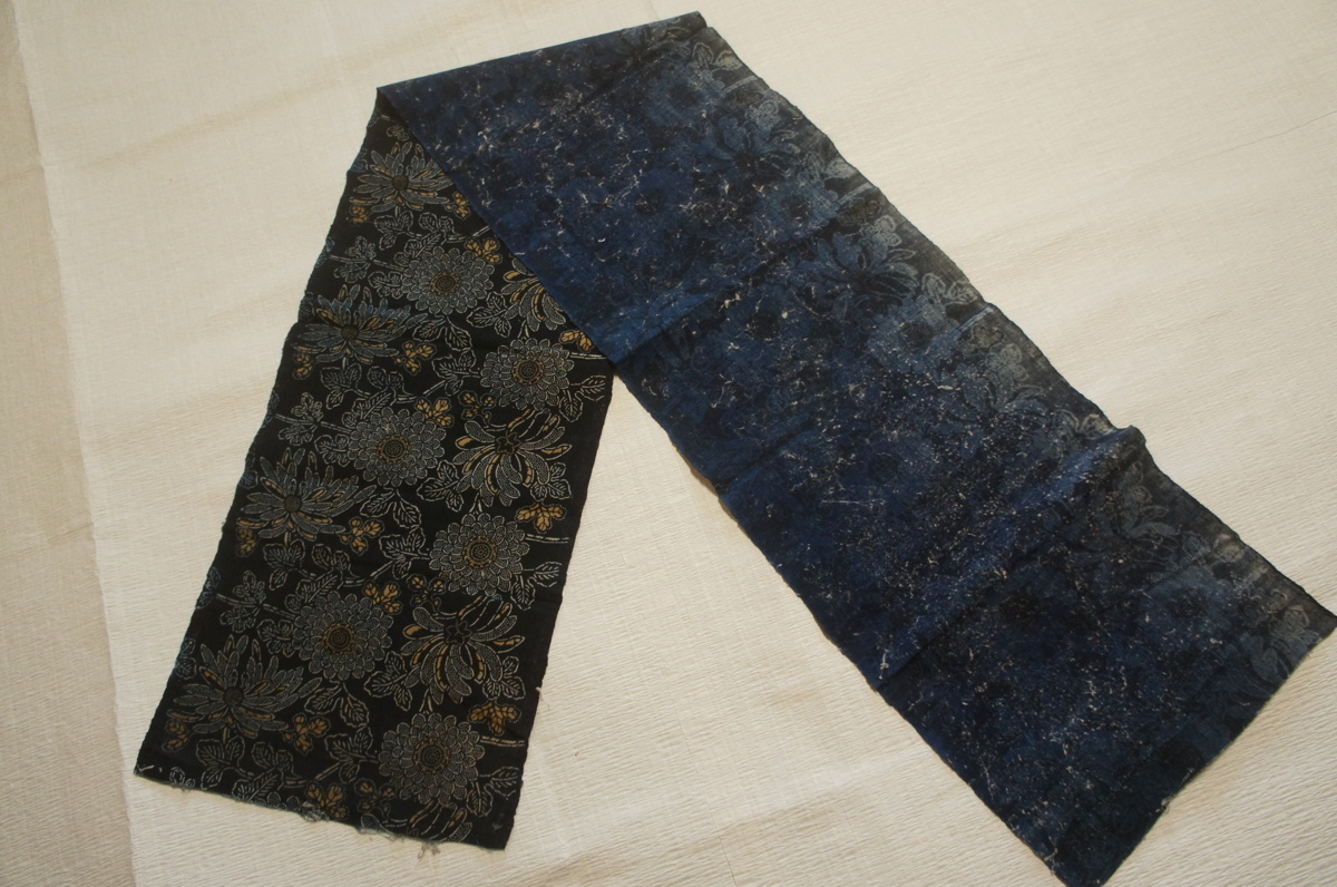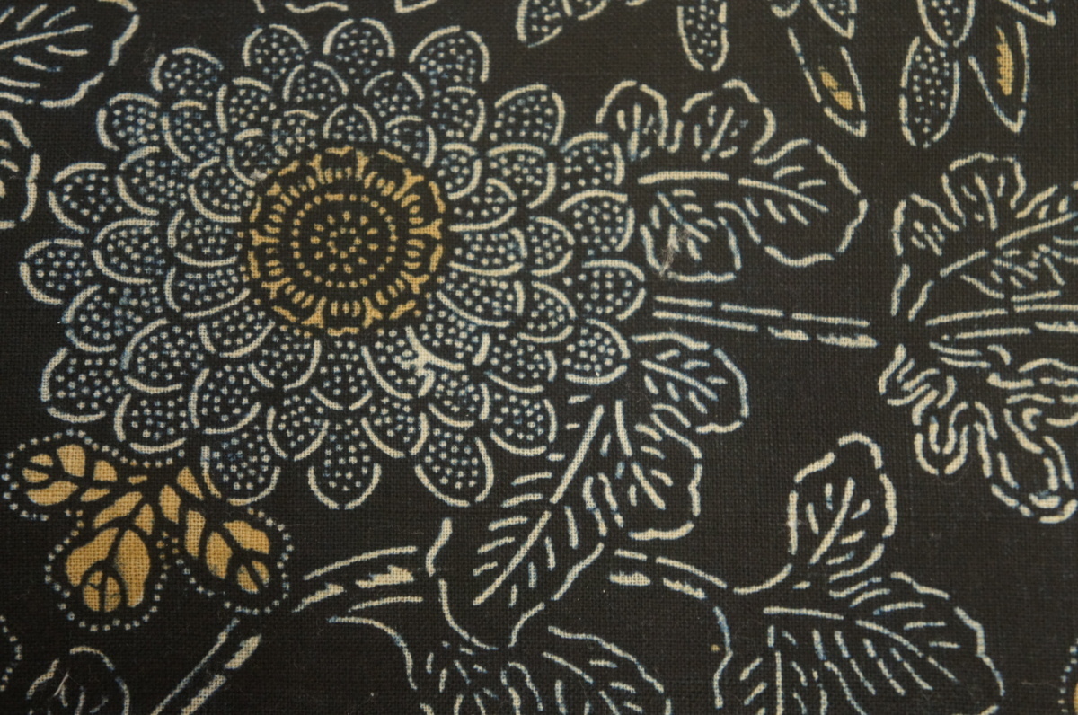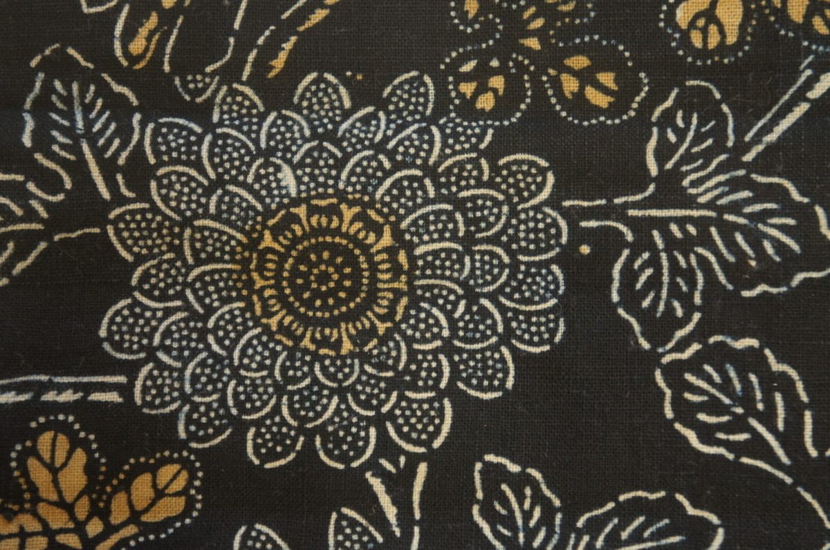 木綿濃藍色地型染菊花模様色入りハギレ[E13639]