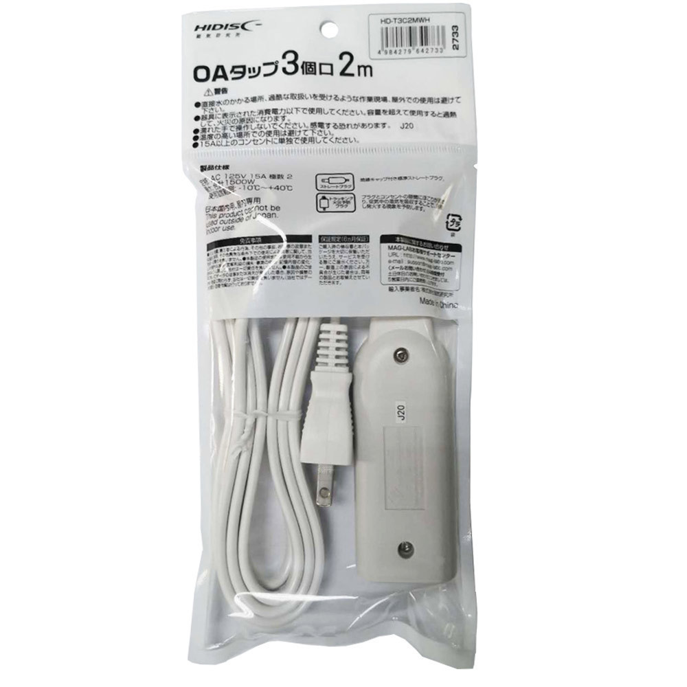 送料無料 電源タップ OAタップ 3個口 コンセント 合計1500W 2m HIDISC HD-T3C2MWH/2733x2本セット/卸