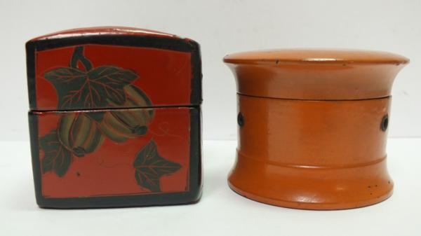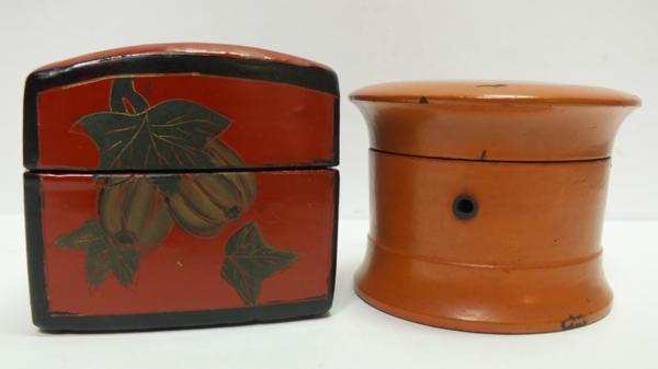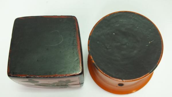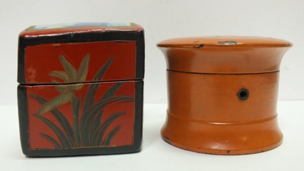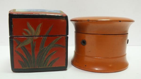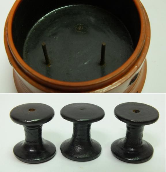 素材:木製。写真左>高さ6.5cm、幅6cm~7cm、奥行き6cm。 写真右>高さ5.5cm、直径7.5cm、幅6.2cm。糸巻き3個付き、糸巻きを差込用の棒が1本折れています。