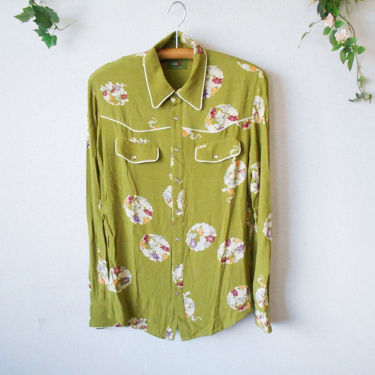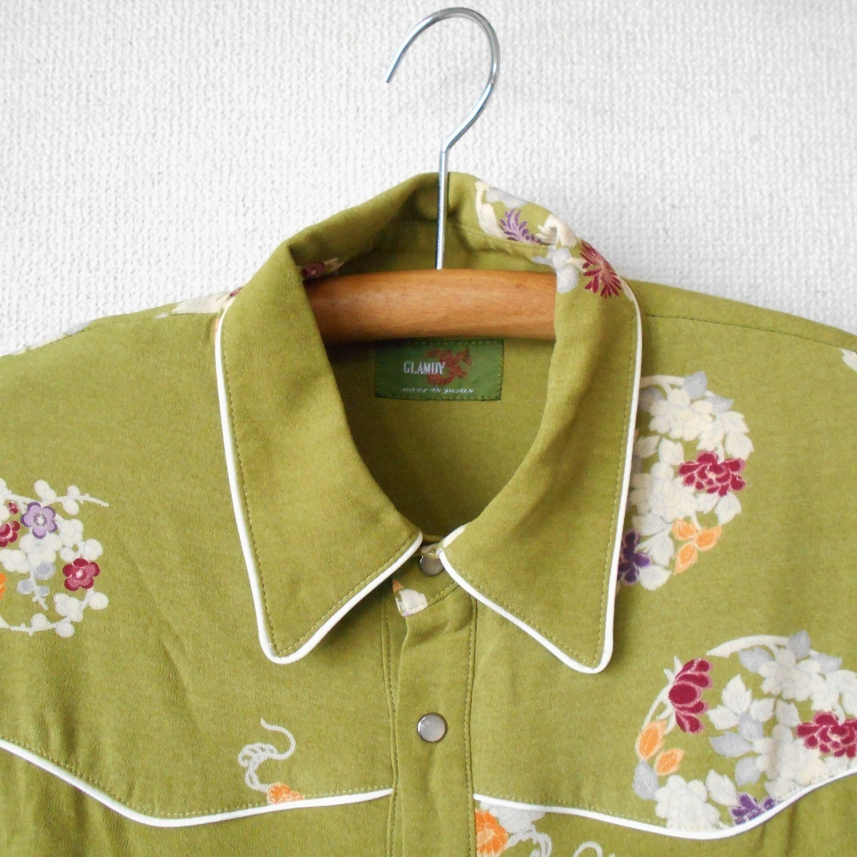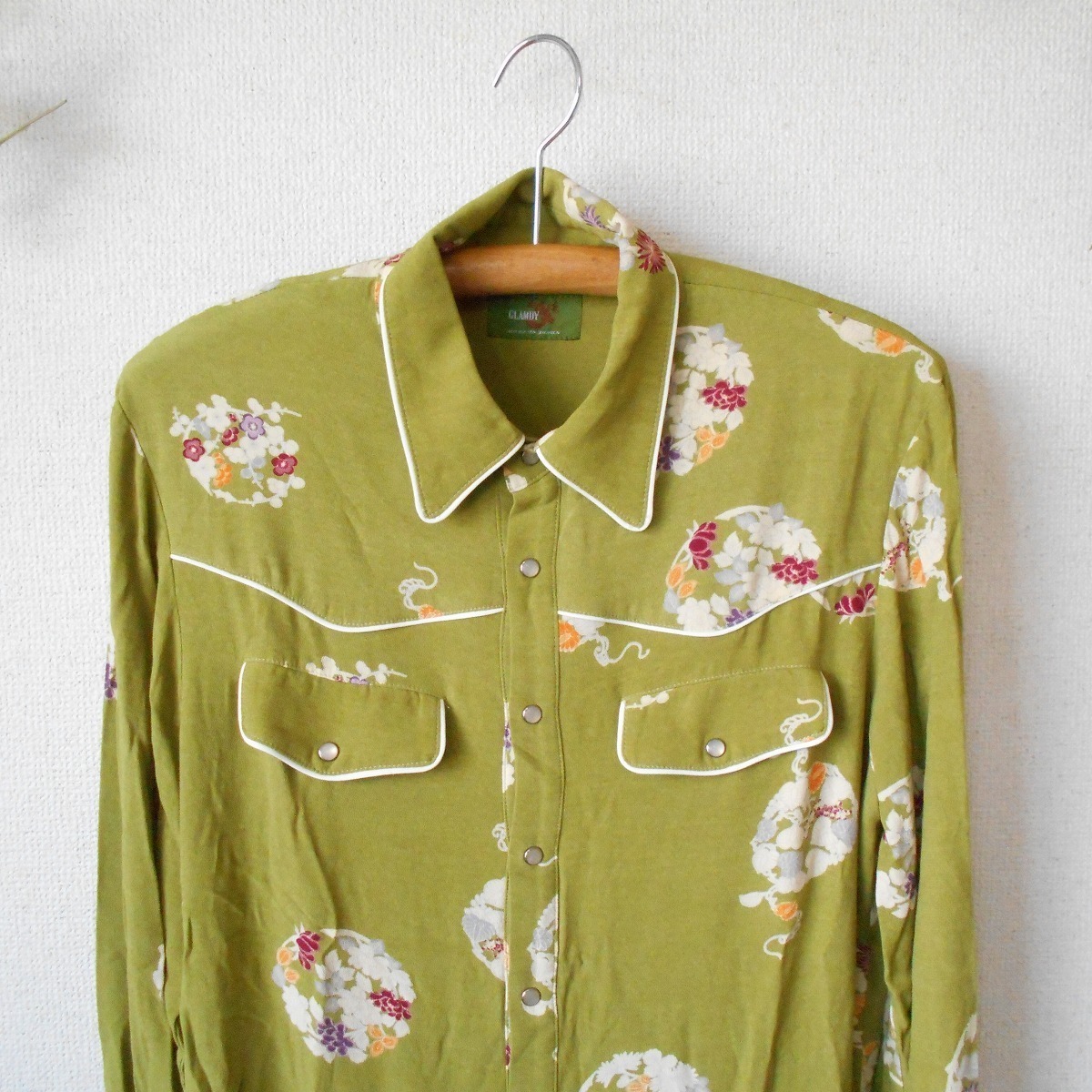 【ポイント】グラムディのシャツになります。お色はグリーン系のベースカラーで、多色使用の和風のプリントが全体に入っています。