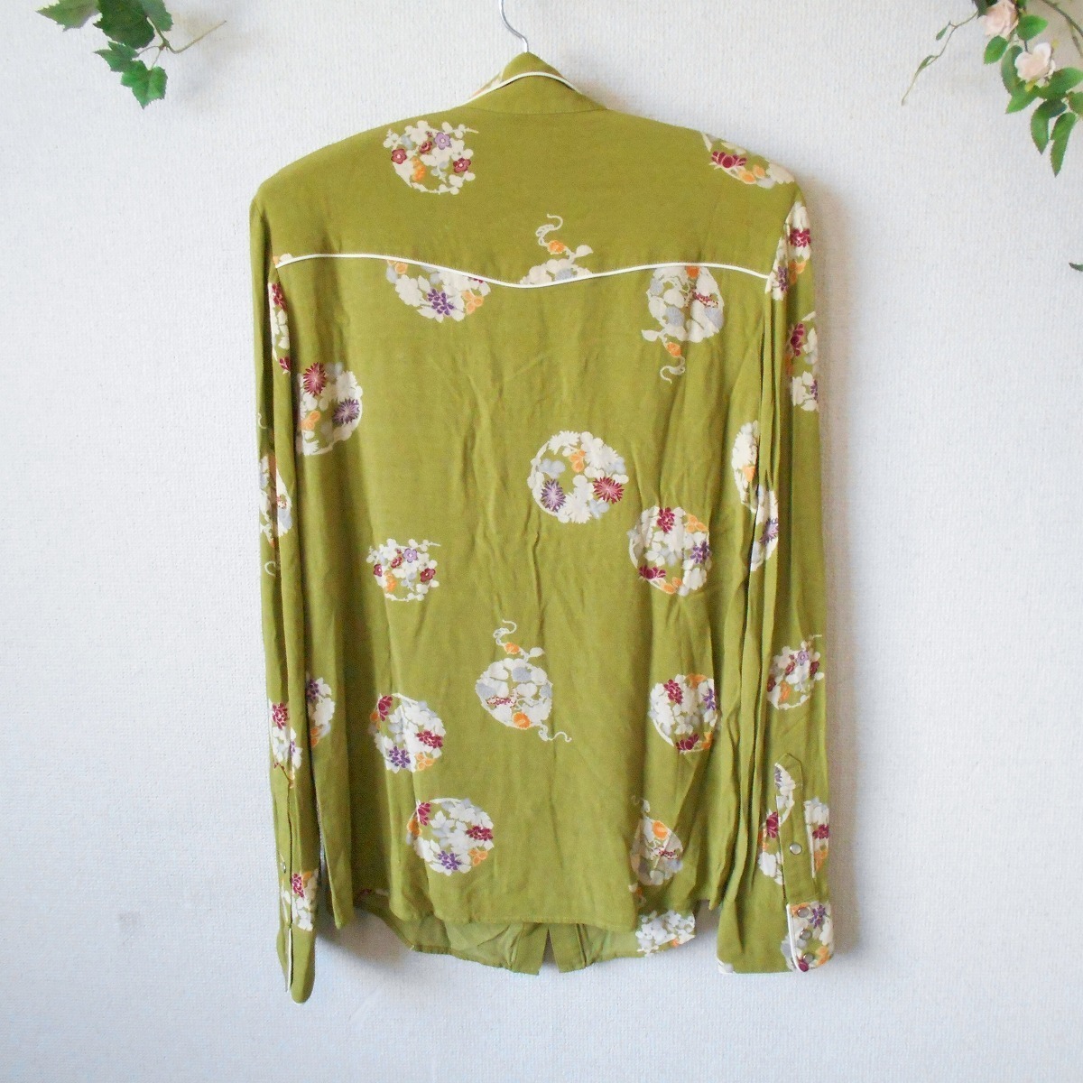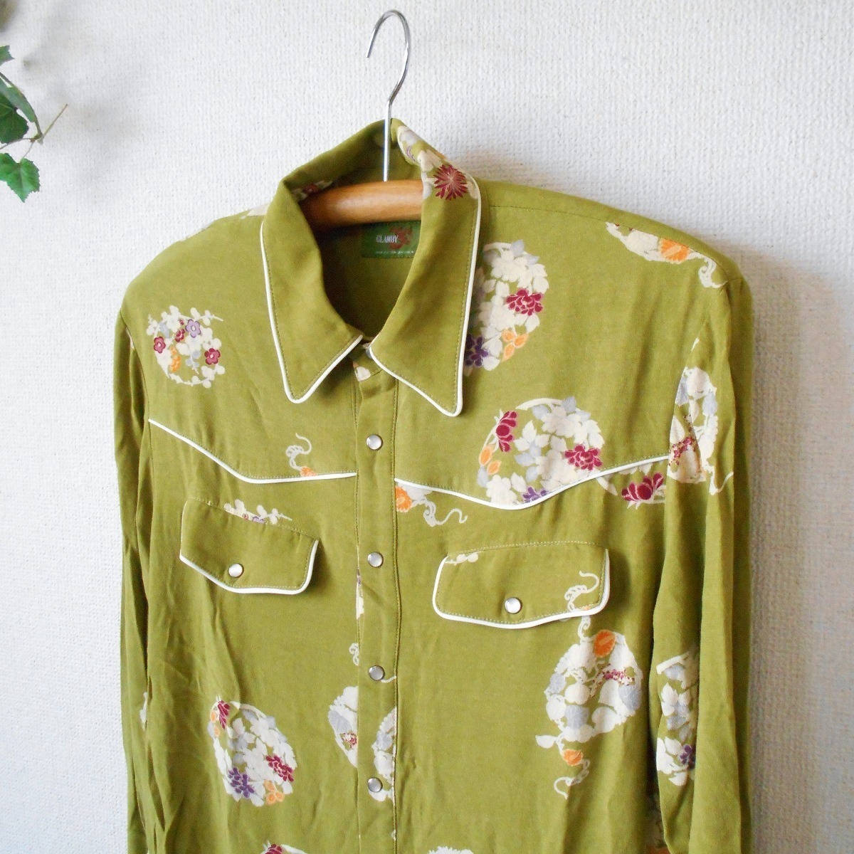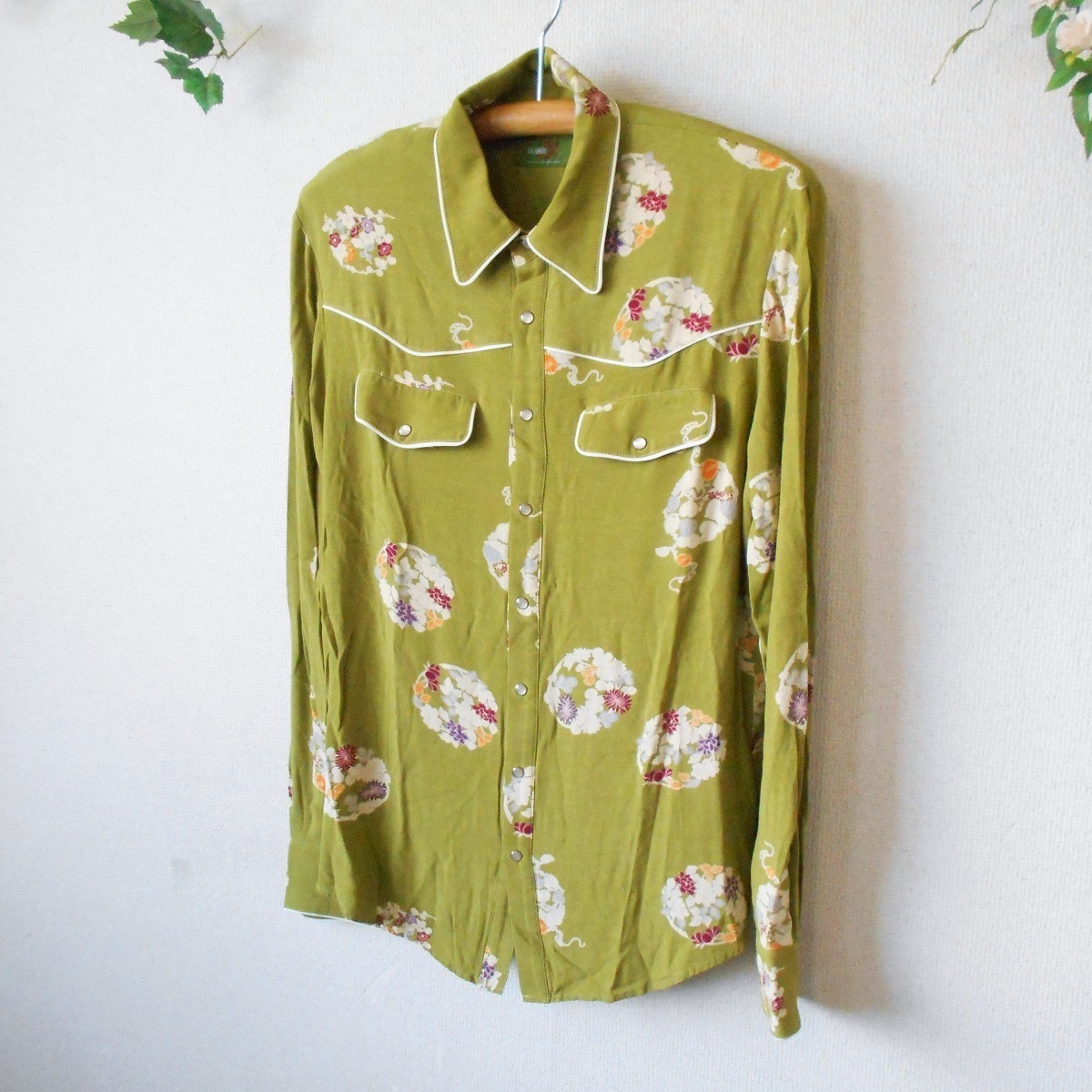 【ポイント】グラムディのシャツになります。お色はグリーン系のベースカラーで、多色使用の和風のプリントが全体に入っています。