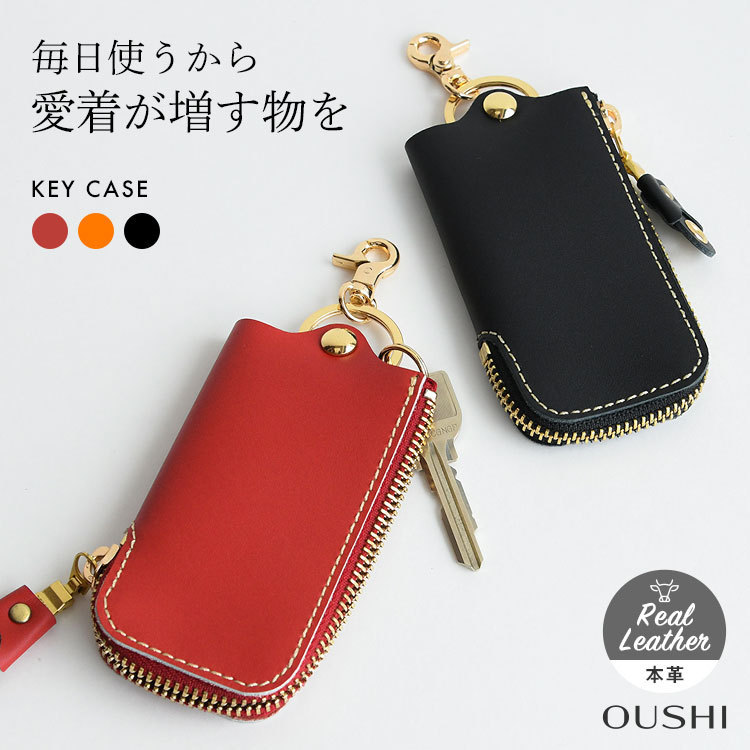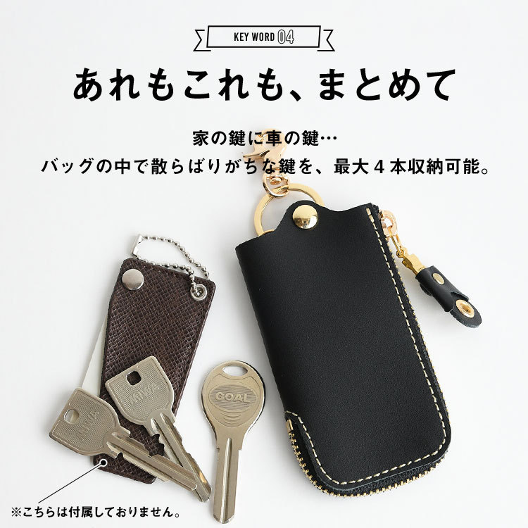 本革を使用したキーケース。シンプルなデザインでバッグやベルトループにつけてもおしゃれです!車のスマートキーにも対応!鍵を4本付けることが可能です。