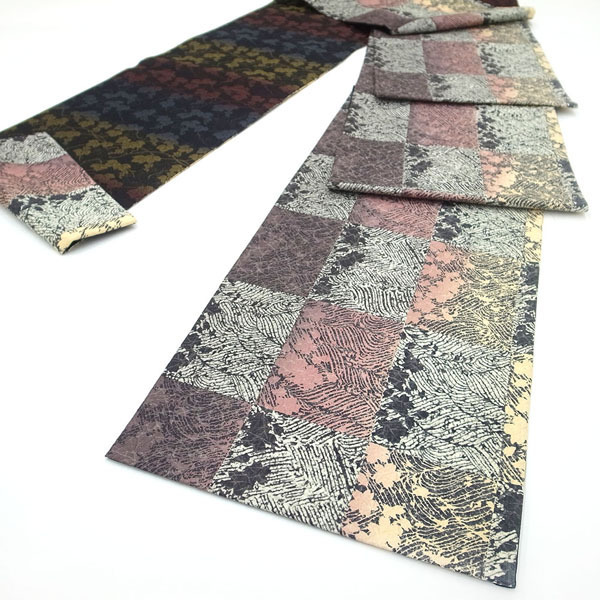 【新品】袋帯 手染め 全通 ふくれ織 地紋 市松 桜 さくら サクラ 花 波 上質 カジュアル 銀糸 黒グレー 白 紫 ピンク 春 正絹 絹 購入 販売 カジュアル 普段着 小紋 紬 新品 仕立て上がり みやがわ sb50050