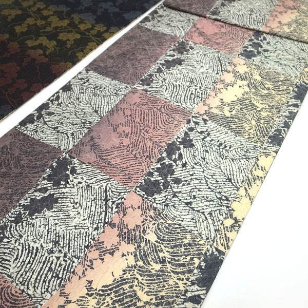袋帯 手染め 全通 ふくれ織 地紋 市松 桜 さくら 波 上質 カジュアル 銀糸 黒グレー 白 紫 ピンク 春 新品 仕立て上がり みやがわ sb50050