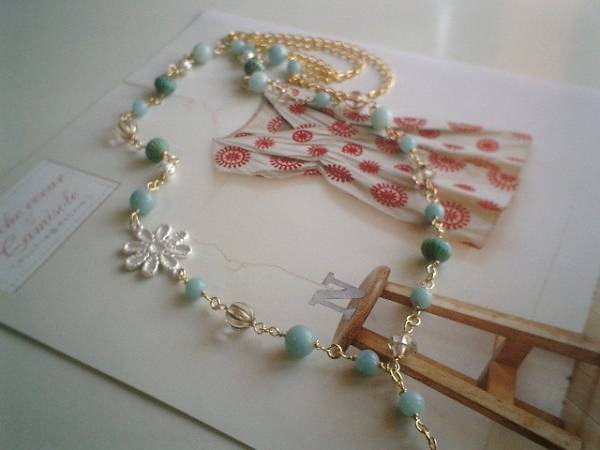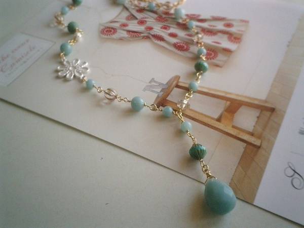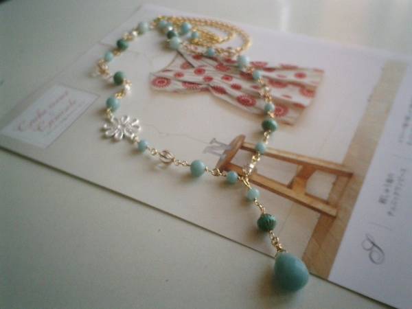 素敵・マニア・・シリーズです♪ノスタルジックな水色・・シックなアマゾナイトのネックレスです♪ブルーグレー色のアマゾナイトにメタルフラワーやデザインチェコビーズを合わせて大人のロマンチックしています♪アマゾナイトは6ミリ、8ミリの丸玉です♪トップのアマゾナイトのドロップカットは13×18ミリ位です♪長さは全長88センチ位で調節自由です♪トップは6センチ位です♪お揃いのブレスレットやイヤリングも出品しています♪シンプルで飽きのこないいつまでも着けられるデザインを考えて作りました♪ハンドメイドをご理解頂いてノークレーム、ノーリターンでお願いします