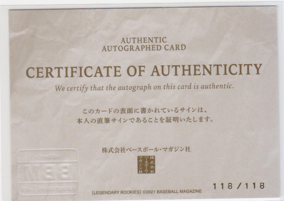 パックから出る直筆サインカードでシリアルナンバーが入っています。シリアルナンバーは118/118のラストナンバーです。