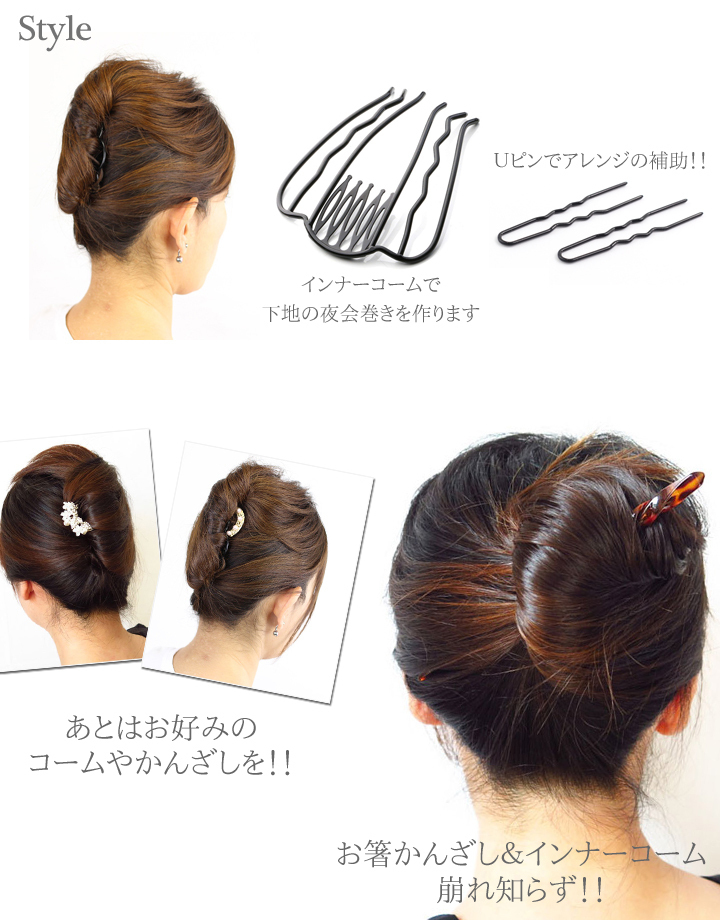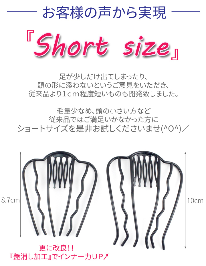 商品説明 | モアコーム・ボーテ6本足とUピン2本のセットです。 *ブラックとブラウンの2色がございますが、セットアイテムは全て同色となります。 ショートサイズはUピンも艶消しのものとなります。 お客様の声から実現!『ショートサイズ』 足が少しだけ出てしまったり、頭の形に添わないというご意見をいただき、 従来品より足の短いものも開発致しました。 毛量少なめの方や頭の小さい方など従来品ではご満足いかなかった方に ショートサイズを是非お試しいただきたいです(^O^)/ ◆日本特許取得済◆ 夜会巻きコームに新革命!!業界初の表裏ダブルコームでキープ力抜群!! 長い6本足コームが全体をHOLDし、短いコームが付け根部分をHOLD コームをつけたときの嫌なツッパリ感などないため、長時間付けて居られる優れものです。 ヘアアレンジの下地に最適です!! お団子や夜会巻き、くるりんぱ、アレンジ髪・・・バリエーションは広がります! Uピンはアレンジなどの補助にお使いくださいませ。軽くてしっかり留まります。 |