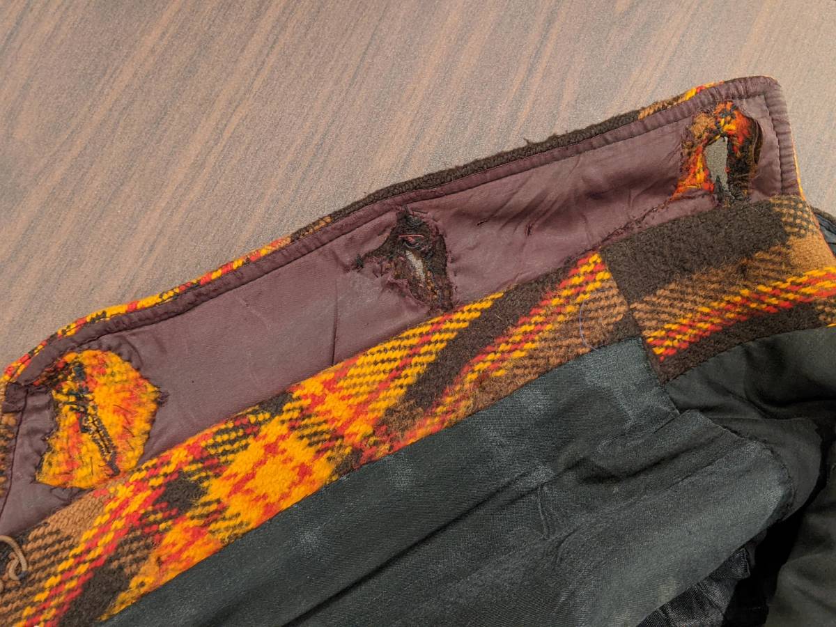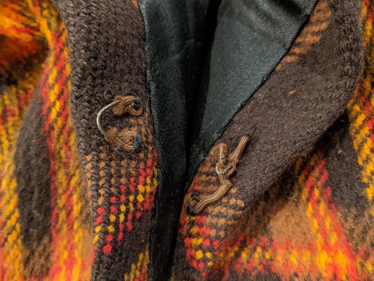 古物特有のズッシリとしたウールではなく、見た目ほどは重量感がない為、薄手のコートやニットなどの上からアクセントとして羽織るのも素敵だと思います