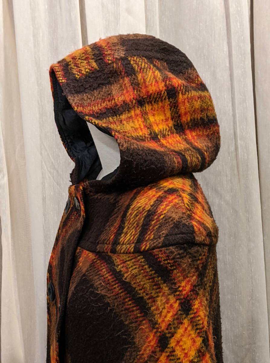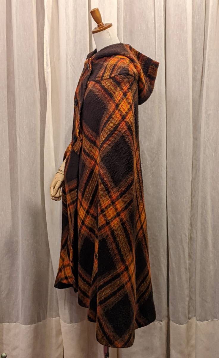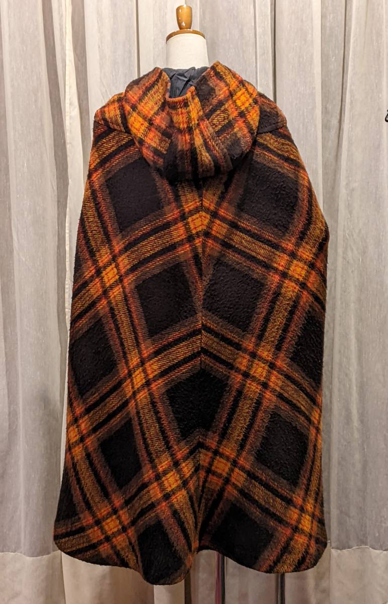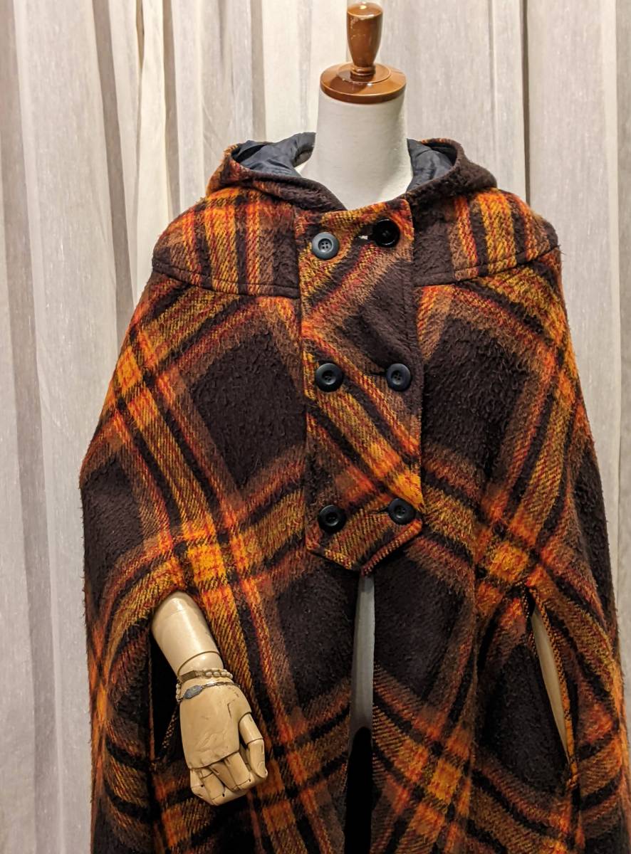 毛足の長いバイアスチェック柄生地がトラディショナルな印象のマント