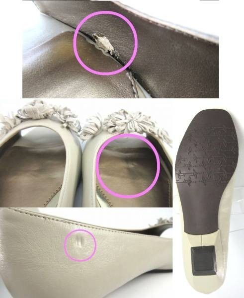 他には素材特有のわずかなシワ、スレやヨゴレ、甲飾りのヨレ等が見受けられる訳あり品となります。ご了承の上のご落札をお願いします。